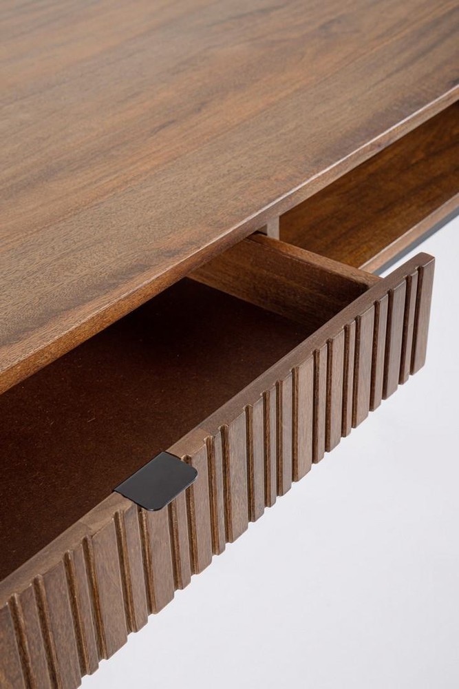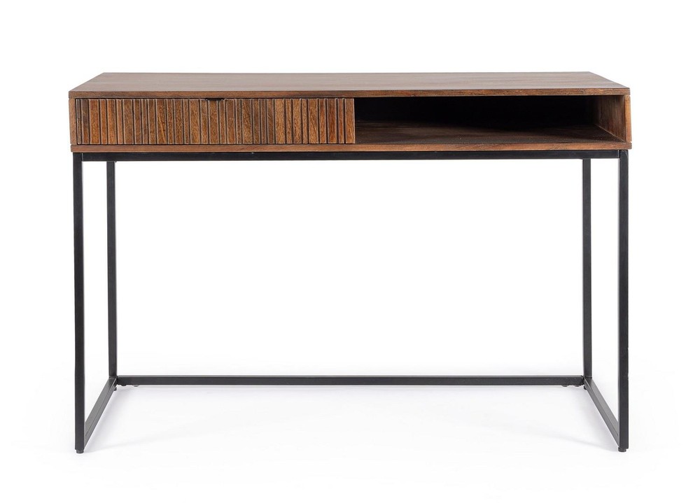 Dieser Schreibtisch verbindet authentische Materialien mit klarer Linienführung und durchdachter Funktionalität. Die Kombination aus natürlich gemasertem Mangoholz, schwarzem Stahl und einem zurückhaltend modernen Design macht ihn zu einem stilvollen Möbelstück für jedes Homeoffice, Arbeitszimmer oder moderne Wohnkonzepte, in denen Ästhetik und Alltagstauglichkeit Hand in Hand gehen. Der Korpus besteht aus Mangoholz, das für seine besondere Härte, Langlebigkeit und charaktervolle Maserung geschätzt wird. Die Oberfläche wurde fein bearbeitet und mit einer hochwertigen Lackierung auf Nitrocellulose-Basis versehen. Dieses Finish bewahrt die natürliche Schönheit des Holzes, schützt es gleichzeitig vor alltäglichen Gebrauchsspuren und verleiht ihm einen dezent seidigen Glanz. Die Rückwand besteht aus MDF und ergänzt das Gesamtbild unauffällig und funktional. Sie verleiht dem Schreibtisch zusätzliche Stabilität und sorgt für eine saubere Rückseite, falls der Tisch frei im Raum stehen soll. Das Untergestell besteht aus stabilem Stahl, das mit einer schwarzen, epossidischen Pulverbeschichtung versehen ist. Diese schützt das Material dauerhaft vor Korrosion und verleiht den schlanken Beinen eine matte, moderne Optik, die einen gelungenen Kontrast zum warmen Holz bildet. Die Konstruktion sorgt für einen festen Stand und trägt zur leichten, offenen Anmutung des Möbels bei. Für Ordnung und Funktionalität im Arbeitsalltag sorgt eine praktische Schublade auf der linken Seite, die Platz für Schreibutensilien, Dokumente oder persönliche Gegenstände bietet. Auf der rechten Seite befindet sich ein offenes Fach, das sich ideal für Bücher, Notizblöcke oder dekorative Elemente eignet. Mit einer Breite von etwa 120 Zentimetern, einer Tiefe von rund 60 Zentimetern und einer Höhe von etwa 78 Zentimetern bietet der Tisch ausreichend Platz zum Arbeiten – ohne dabei wuchtig zu wirken. Er fügt sich harmonisch in verschiedenste Raumkonzepte ein und wirkt dank seiner ausgewogenen Proportionen sowohl modern als auch zeitlos.