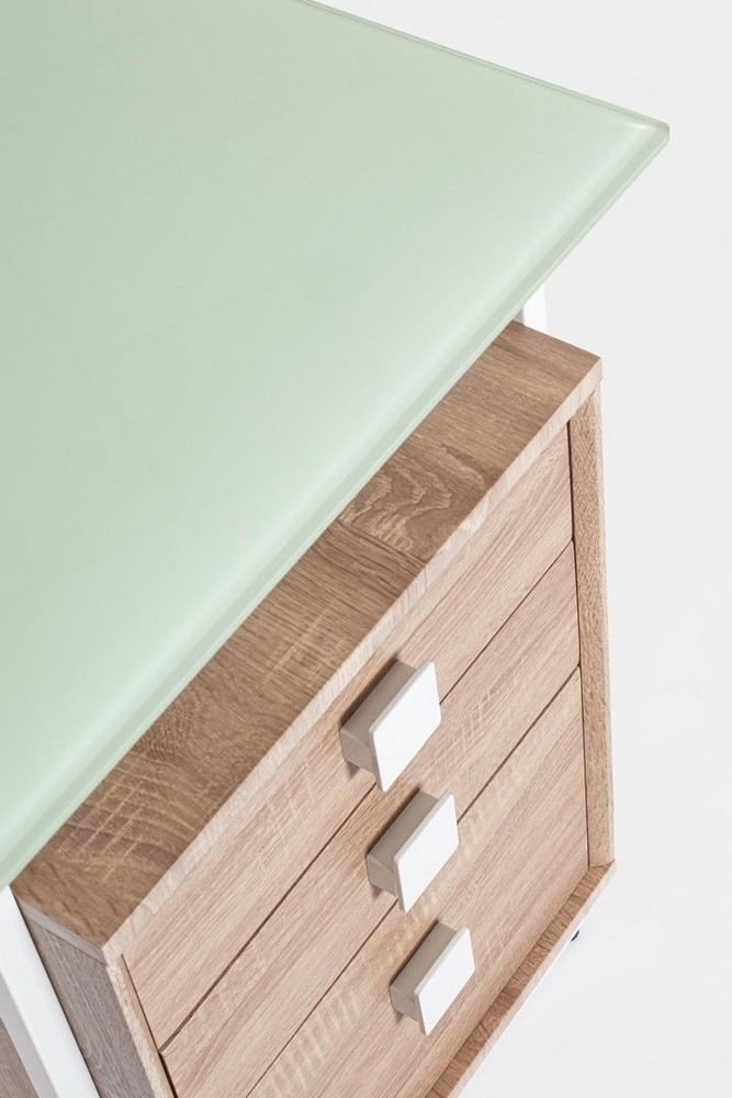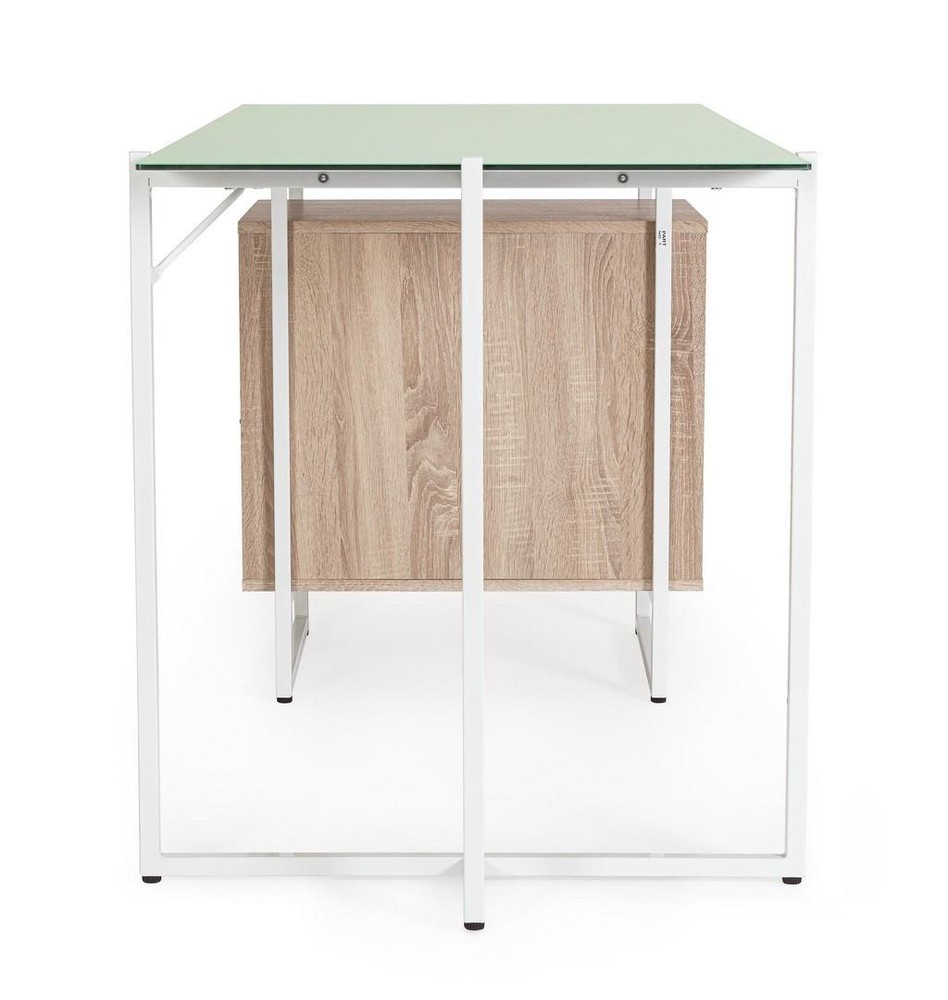Dieser stilvolle Schreibtisch verbindet modernes Design mit durchdachter Funktionalität und wird zum zentralen Arbeitsplatz in jedem Home-Office, Arbeitszimmer oder Studio. Das stabile Gestell aus pulverbeschichtetem Stahl mit weißem Finish sorgt für hohe Stabilität und Langlebigkeit, während die klare Linienführung dem Schreibtisch ein modernes, zeitloses Erscheinungsbild verleiht. Die Schreibtischplatte aus gehärtetem Glas wirkt leicht und elegant, gleichzeitig robust und pflegeleicht. Sie bietet großzügige Arbeitsfläche für Laptop, Schreibutensilien oder kreative Projekte und lässt sich perfekt mit modernen Bürostühlen und Wohnaccessoires kombinieren. Rechts unter dem Tisch befindet sich ein praktischer Schubladenschrank aus MDF mit PVC-Beschichtung, der zusätzlichen Stauraum für Unterlagen, Büroartikel oder persönliche Gegenstände bietet. Die ersten beiden Schubladen sind kompakt und ideal für kleinere Utensilien, während die dritte, untere Schublade größer gestaltet ist und mehr Stauraum für Aktenordner oder größere Objekte bereitstellt. Die Griffe aus Stahl mit weißem Finish runden das harmonische Design ab und sorgen für eine elegante, einheitliche Optik. Mit den Maßen von ca. 142 x 76 x 69 cm (B x H x T) bietet der Schreibtisch ausreichend Platz, ohne den Raum zu überladen, und passt sich flexibel an unterschiedliche Raumgrößen und Einrichtungskonzepte an.