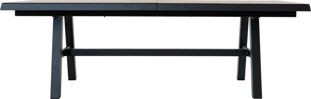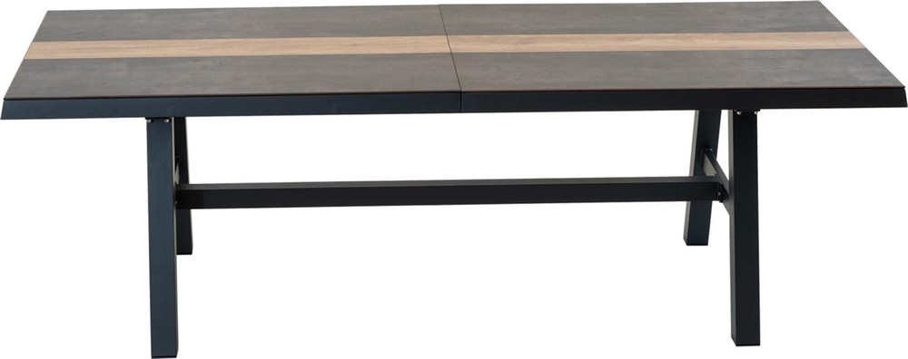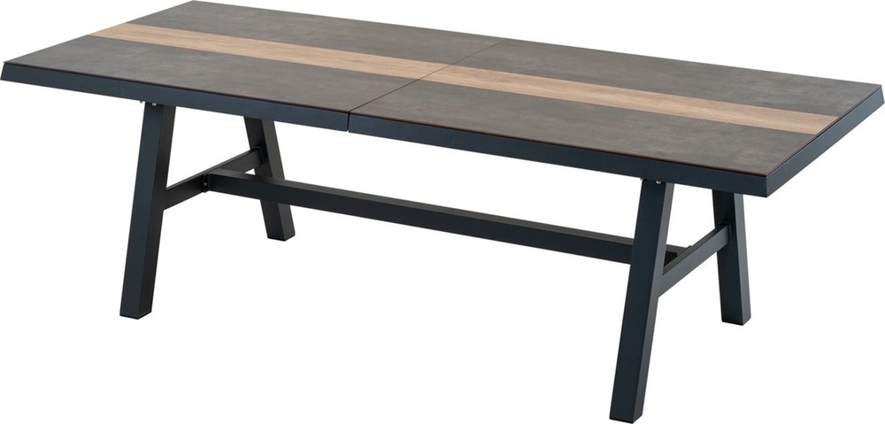 Dieser elegante Ausziehtisch verbindet modernes Design, hochwertige Materialien und flexible Funktionalität in Perfektion. Mit seinen großzügigen Maßen von ca. 243/303 x 102 x 76 cm bietet er reichlich Platz für Familie, Freunde oder besondere Anlässe – und lässt sich bei Bedarf im Handumdrehen verlängern. Das Gestell aus robustem Aluminium überzeugt durch Stabilität und ein edles Finish in Anthrazit, das dem Tisch eine klare, zeitgemäße Optik verleiht. Die Kombination aus schlanker Linienführung und der kegelförmigen Struktur sorgt für eine harmonische Balance zwischen Leichtigkeit und Standfestigkeit. Die Tischplatte aus hochwertigem HPL (High Pressure Laminate) zeigt sich in einem warmen Braunton, der durch einen hellbraunen Mittelstreifen raffiniert akzentuiert wird. Dieses feine Designdetail verleiht dem Tisch einen besonderen Charakter und hebt ihn optisch von herkömmlichen Modellen ab. HPL zeichnet sich durch eine besonders glatte, widerstandsfähige und pflegeleichte Oberfläche aus – ideal für den täglichen Gebrauch, egal ob im Wohnraum, im Wintergarten oder auf einer überdachten Terrasse. Mit der praktischen Ausziehfunktion lässt sich die Tischlänge mühelos von 243 cm auf beeindruckende 303 cm erweitern, sodass spontane Gäste jederzeit willkommen sind. Trotz seiner Größe bleibt der Tisch dank seines klaren Designs elegant und modern. Ob als stilvoller Mittelpunkt im Esszimmer oder als vielseitiger Tisch im halbgeschützten Außenbereich – dieses Modell überzeugt durch Flexibilität, Qualität und ein harmonisches Designkonzept, das viele Einrichtungsstile perfekt ergänzt.
