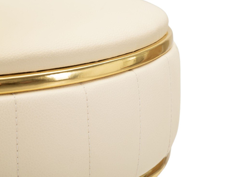 Dieser elegante Barhocker vereint modernes Design, luxuriöse Details und hochwertigen Komfort und wird zum stilvollen Highlight in Ihrer Küche, Bar oder Ihrem Wohnbereich. Die schlanken Beine sind in einem dezenten schwarzen Finish gehalten und setzen einen klaren, modernen Akzent. Besonders auffällig sind die feinen goldfarbenen Details an den unteren Enden der Beine, die dem Hocker eine edle, luxuriöse Note verleihen. Für zusätzlichen Komfort und Stabilität sorgt die runde Fußstütze, die ebenfalls mit einem goldfarbenen Finish veredelt ist. Sie ermöglicht bequemes Abstellen der Füße und unterstreicht gleichzeitig die elegante Linienführung des Barhockers. Der Sitz ist mit beigem Polyurethan gepolstert und bietet eine angenehme, weiche Sitzfläche. Zwei dekorative goldene Ringe auf dem Sitz fügen stilvolle Akzente hinzu und harmonieren perfekt mit den goldenen Details an Füßen und Fußstütze. Die runde Form des Sitzes sorgt für Komfort und eine ausgewogene Optik, die den Hocker sowohl modern als auch elegant erscheinen lässt. Mit seinen Maßen von ca. 37 x 74 x 38 cm (Breite x Höhe x Tiefe) besitzt der Hocker die ideale Höhe für Bar- und Tresenbereiche, ohne dabei wuchtig zu wirken. Dank der Kombination aus schwarzem Finish, goldenen Akzenten und beige-poliuertem Sitz fügt er sich harmonisch in verschiedene Einrichtungsstile ein – von modern-minimalistisch über glamourös bis skandinavisch-elegant. Dieser Barhocker verbindet modernes Design, edle Details und komfortables Sitzen in einem stilvollen Möbelstück und wird so zu einem dekorativen und funktionalen Highlight in jedem Raum.