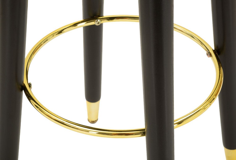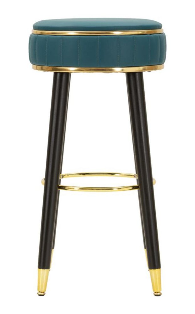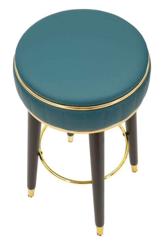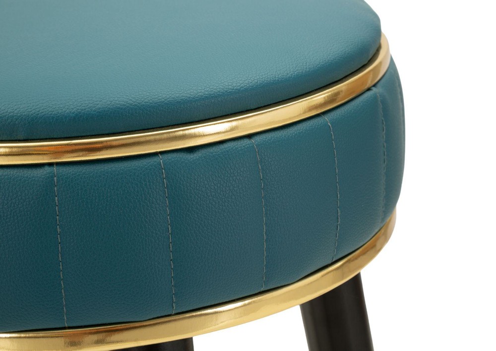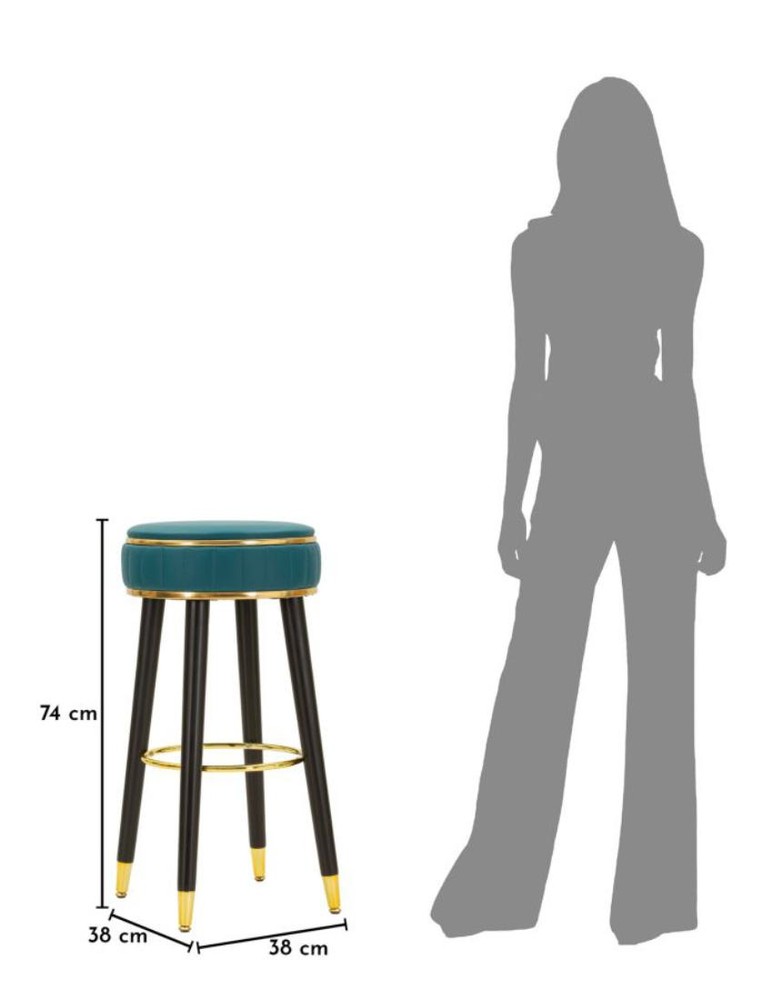 Dieser stilvolle Barhocker vereint modernes Design mit luxuriösen Details und wird zu einem eleganten Blickfang in Ihrer Küche, Bar oder Ihrem Wohnbereich. Die klare, runde Form des Sitzes harmoniert perfekt mit der stabilen Konstruktion aus vier Beinen, während die Kombination aus Schwarz, Türkis und Gold für eine raffinierte, edle Optik sorgt. Der Sitz ist mit hochwertigem türkisen Polyurethan bezogen und durch zwei goldene Ringe dekorativ akzentuiert, die dem Hocker eine luxuriöse Note verleihen. Die runde Sitzfläche bietet nicht nur angenehmen Komfort, sondern setzt zugleich einen modernen, stilvollen Akzent in jedem Raum. Die Beine des Hockers sind in einem eleganten schwarzen Finish gehalten, das durch goldfarbene Details an den unteren Enden veredelt wird. Für zusätzlichen Komfort und Stabilität sorgt die Fußstütze: ein runder Ring mit glänzendem Goldfinish, der das Hinsetzen und Abstützen angenehm macht und gleichzeitig das edle Design unterstreicht. Mit seinen Maßen von ca. 37 x 74 x 38 cm (Breite x Höhe x Tiefe) bietet der Barhocker eine ergonomische Sitzhöhe, die sich ideal für Tresen, Kücheninseln oder hohe Tische eignet. Die Kombination aus stabiler Konstruktion, luxuriösen Akzenten und modernem Design macht ihn zu einem stilvollen Möbelstück, das Funktionalität und Ästhetik perfekt vereint. Dieser Barhocker ist nicht nur praktisch, sondern auch ein dekoratives Statement: er bringt Farbe, Eleganz und modernen Chic in Ihre Einrichtung und wird so zu einem echten Highlight in jedem Raum.
