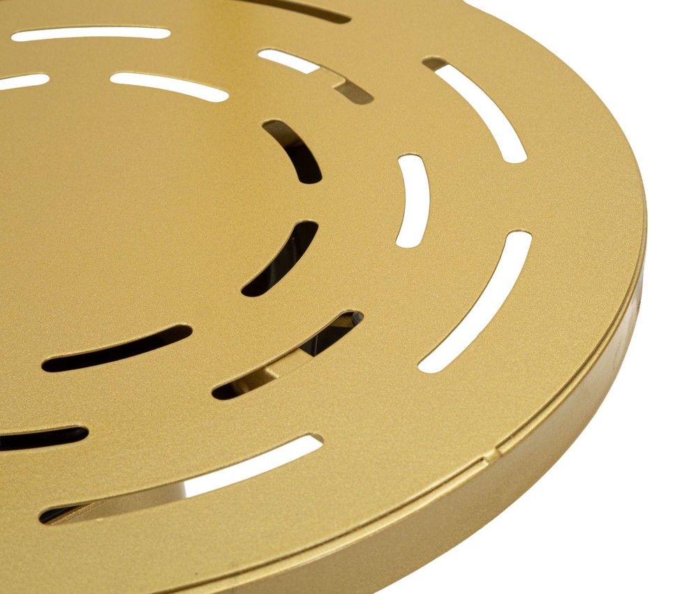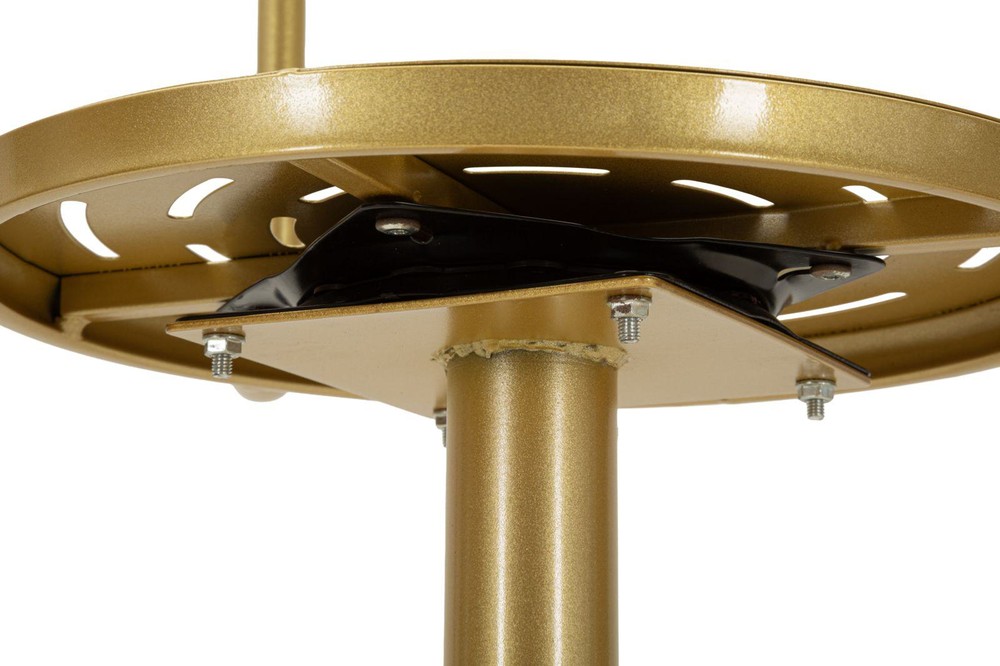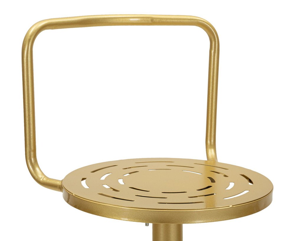 Dieser stilvolle Barhocker vereint modernes Design mit funktionaler Stabilität und wird schnell zu einem eleganten Blickfang in Ihrer Küche, an der Hausbar oder im Essbereich. Gefertigt aus robustem Metall und veredelt mit einem edlen goldenen Finish, strahlt der Hocker eine besondere Eleganz aus und setzt zugleich einen modernen Akzent in Ihrem Wohnraum. Die runde Sitzfläche überzeugt durch ihr dekoratives, offenes Lochmuster. Dieses Design verleiht dem Barhocker nicht nur eine leichte und moderne Optik, sondern sorgt gleichzeitig für eine angenehme Luftzirkulation beim Sitzen. Die harmonisch geschwungene Rückenlehne bietet zusätzlichen Halt und rundet das stilvolle Gesamtbild des Hockers ab. Für zusätzlichen Komfort sorgt die integrierte Fußstütze, die bequemes Sitzen auch über längere Zeit ermöglicht. Das stabile Standrohr sowie der runde Sockel sorgen für einen sicheren und festen Stand. Durch die solide Metallkonstruktion ist der Barhocker besonders langlebig und eignet sich ideal für den täglichen Gebrauch. Mit seinen kompakten Maßen von ca. 38 x 94 x 38 cm (Breite x Höhe x Tiefe) lässt sich der Barhocker flexibel einsetzen und passt auch in kleinere Räume oder an schmale Theken. Gleichzeitig bietet er eine komfortable Sitzhöhe, die perfekt für Bartische, Kücheninseln oder Hausbars geeignet ist. Ob als stilvolle Sitzgelegenheit für gesellige Abende oder als dekoratives Möbelstück mit modernem Charakter – dieser Barhocker verbindet elegantes Design, Stabilität und Komfort auf ansprechende Weise