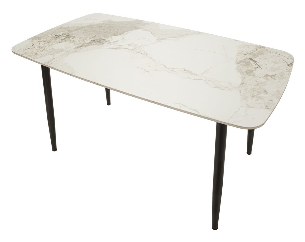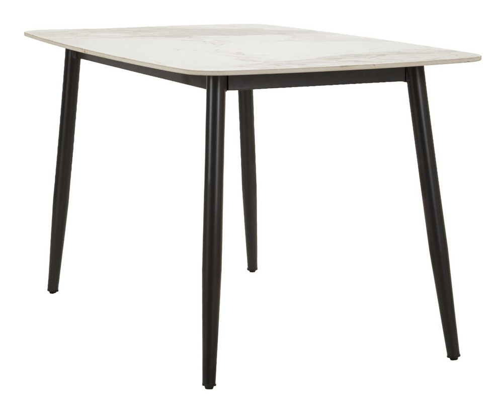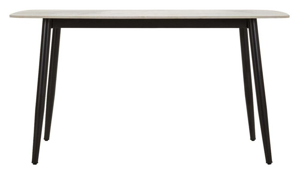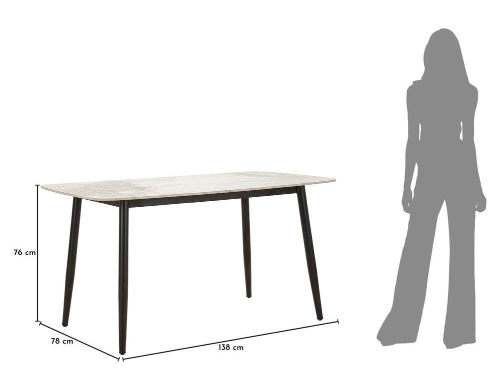 Dieser elegante Esstisch verbindet modernes Design mit hochwertigen Materialien und wird zum stilvollen Mittelpunkt Ihres Essbereichs. Die Kombination aus einer edlen Tischplatte und einem stabilen Metallgestell verleiht dem Tisch eine zeitlose Ausstrahlung, die sich harmonisch in verschiedene Einrichtungsstile einfügt – von modern und minimalistisch bis hin zu elegant und klassisch. Die Tischplatte besteht aus hochwertiger Keramik in Weiß mit einem ansprechenden Marmor-Effekt. Die feine Maserung sorgt für eine edle Optik und macht die Oberfläche zu einem besonderen Blickfang. Gleichzeitig überzeugt Keramik durch ihre robuste und pflegeleichte Beschaffenheit, wodurch sich der Tisch ideal für den täglichen Gebrauch eignet. Die abgerundeten Ecken der Tischplatte verleihen dem Design eine weiche, moderne Note und tragen zudem zu mehr Sicherheit und Komfort im Alltag bei. Das stabile Gestell aus Metall mit schwarzem Finish bildet einen stilvollen Kontrast zur hellen Tischplatte und sorgt gleichzeitig für einen sicheren Stand. Die klaren Linien des Gestells unterstreichen das moderne Gesamtbild und verleihen dem Tisch eine elegante, zugleich aber auch solide Ausstrahlung. Mit seinen Maßen von ca. 138 x 78 x 76 cm (Länge x Breite x Höhe) bietet der Esstisch ausreichend Platz für mehrere Personen und eignet sich perfekt für gemeinsame Mahlzeiten, gesellige Abende oder gemütliche Zusammenkünfte mit Familie und Freunden.