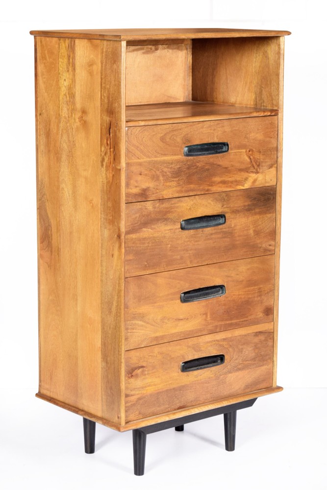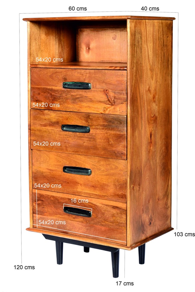 Dieses stilvolle Highboard aus hochwertigem Mangoholz vereint natürliche Materialien mit zeitlosem Design und wird so zum eleganten Blickfang in jedem Raum. Der Korpus präsentiert sich in einem warmen, natürlichen Finish, das die lebendige Maserung des Holzes besonders schön zur Geltung bringt. Jedes Stück ist ein Unikat, das durch seine authentische Optik und hochwertige Verarbeitung überzeugt. Die Beine und Griffe sind mit einem schwarzen Finish versehen. Diese harmonische Farbgestaltung erzeugt einen stilvollen Kontrast zum hellen Korpus und verleiht dem Highboard einen modernen, zugleich warmen Charakter. Das Zusammenspiel von hellem Holz und dunklen Akzenten unterstreicht die klare Linienführung des Möbelstücks. Der untere Bereich ist mit vier auseinanderliegenden Schubladen ausgestattet, die großzügigen Stauraum für Alltagsgegenstände, Dokumente oder persönliche Accessoires bieten. Jede Schublade lässt sich leichtgängig öffnen und schließen und sorgt für eine aufgeräumte, ordentliche Optik. Darüber befindet sich ein offenes Fach mit Rückwand, das sich ideal für Dekoration, Bücher, Pflanzen oder persönliche Lieblingsstücke eignet und dem Highboard eine attraktive, offene Präsentationsfläche verleiht. Mit den Maßen von ca. 60 × 120 × 45 cm (Breite × Höhe × Tiefe) bietet das Highboard viel Stauraum, ohne dabei wuchtig zu wirken. Es passt perfekt in Wohnzimmer, Flur, Arbeitszimmer oder Essbereich und fügt sich harmonisch in unterschiedlich große Räume ein. Die obere Ablagefläche kann zusätzlich für dekorative Zwecke genutzt werden. Ein hochwertiges Möbelstück, das natürliche Materialien, praktischen Stauraum und modernes Design elegant miteinander verbindet. Dieses Highboard aus Mangoholz ist die ideale Wahl für alle, die ein langlebiges, stilvolles und funktionales Möbelstück für ihr Zuhause suchen.