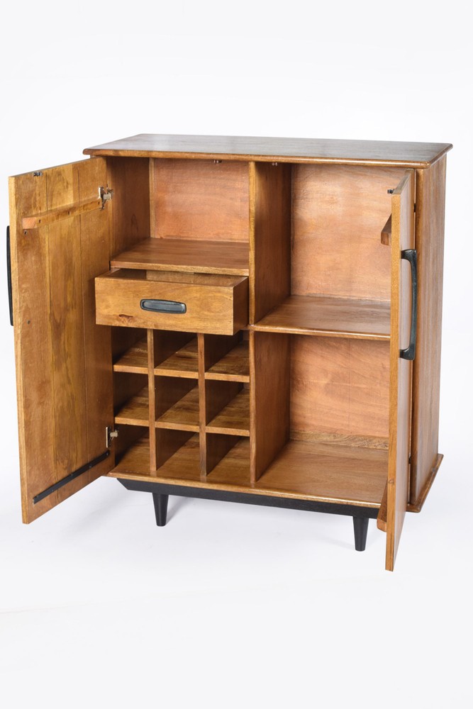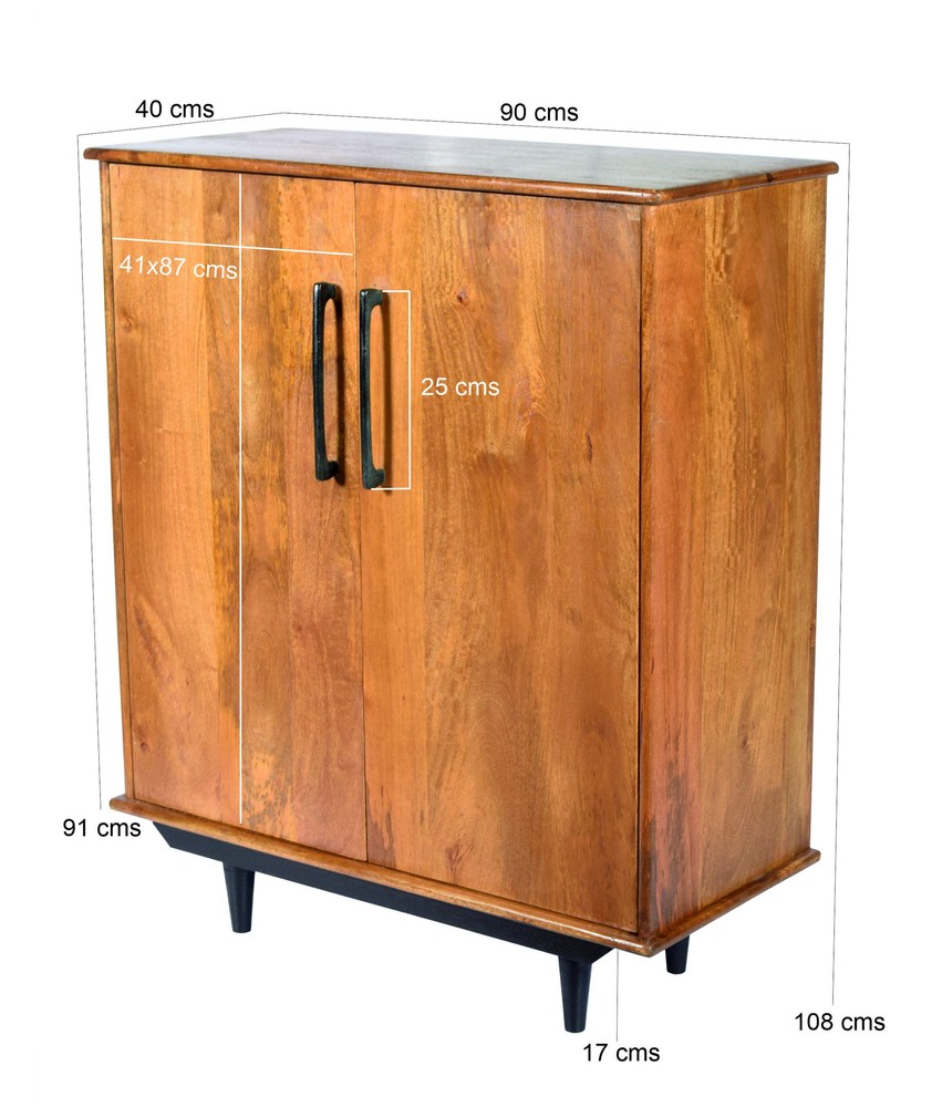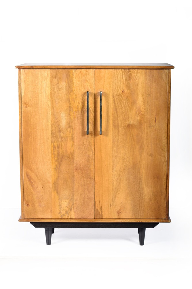 Dieses exklusive Highboard aus hochwertigem Mangoholz vereint natürliche Materialien mit durchdachtem Design und wird so zu einem stilvollen Blickfang in jedem Wohnraum. Der Korpus präsentiert sich in einem warmen, natürlichen Finish, das die charakteristische Maserung des Holzes besonders schön zur Geltung bringt. Jedes Möbelstück ist ein Unikat und strahlt durch die lebendige Holzstruktur eine warme, einladende Atmosphäre aus. Die Beine und Griffe sind mit einem schwarzen Finish versehen und setzen elegante, kontrastreiche Akzente. Durch diesen harmonischen Materialmix entsteht ein modernes, zugleich zeitloses Design, das sich mühelos in unterschiedlichste Wohnstile integrieren lässt – von modern über skandinavisch bis hin zu industrial inspirierten Einrichtungen. Beim Öffnen beider Türen offenbart sich ein großzügiger Stauraum: auf der rechten Seite befinden sich zwei übereinanderliegende große Fächer, ideal für größere Gegenstände, Ordner oder dekorative Accessoires. Die linke Seite bietet ein vielseitiges Aufbewahrungskonzept: oben ein etwas kleineres Fach, direkt darunter eine praktische kleine Schublade, gefolgt von neun kleinen, quadratischen Fächern, die sich perfekt für kleinere Gegenstände, Sammlerstücke oder dekorative Elemente eignen. So verbindet das Highboard Funktionalität mit ästhetischer Vielfalt und schafft Ordnung auf elegante Weise. Mit den Maßen von ca. 90 × 108 × 45 cm (Breite × Höhe × Tiefe) bietet das Highboard ausreichend Stauraum, ohne dabei wuchtig zu wirken. Die Oberfläche kann zusätzlich für Dekoration, Pflanzen, Bilderrahmen oder andere persönliche Lieblingsstücke genutzt werden und setzt stilvolle Akzente im Raum. Ein hochwertiges Möbelstück, das modernes Design, natürliche Materialien und intelligente Stauraumlösungen gekonnt miteinander vereint. Dieses Highboard aus Mangoholz ist die perfekte Wahl für alle, die ein funktionales, langlebiges und zugleich ästhetisches Möbelstück für ihr Zuhause suchen.