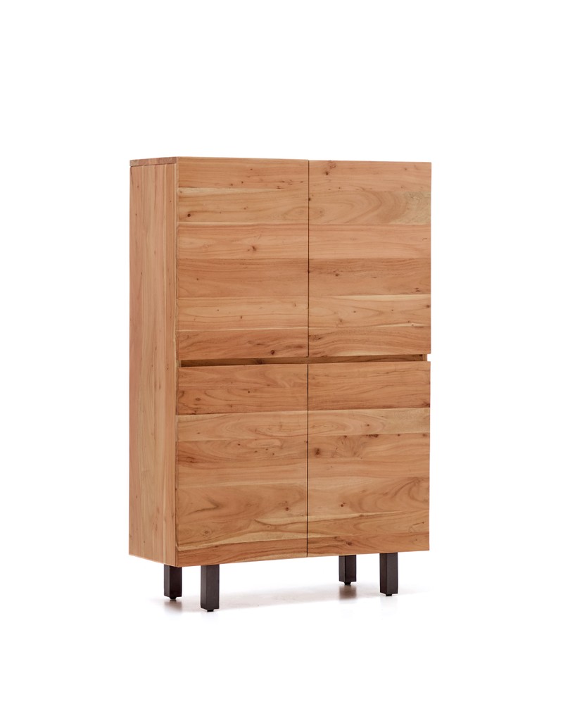 Dieses stilvolle Highboard verbindet natürliche Materialien mit funktionalem Design und setzt einen eleganten Akzent in jedem Wohnraum. Der Korpus aus massivem Akazienholz besticht durch seine individuelle Maserung und das gebleichte Finish, das die warme, helle Farbgebung des Holzes hervorhebt und eine moderne, zeitgemäße Optik schafft. Jede Platte erzählt durch ihre charakteristischen Strukturen die natürliche Geschichte des Holzes und macht das Möbelstück zu einem einzigartigen Unikat. Das Highboard steht auf stabilen Stahlbeinen mit schwarzem Finish, die nicht nur für einen markanten Kontrast sorgen, sondern auch die robuste Basis für den Korpus bilden. Die Beine sind verstellbar, sodass Bodenunebenheiten problemlos ausgeglichen werden können und das Highboard stets sicher und stabil steht. Hinter den vier Türen verbergen sich jeweils zwei geräumige Fächer, die ausreichend Stauraum für Bücher, Geschirr, Dekoration oder andere persönliche Gegenstände bieten. Die Scharniere mit sanftem Schließmechanismus sorgen für ein leises und elegantes Öffnen und Schließen der Türen und unterstreichen den hochwertigen Gesamteindruck des Möbelstücks. Mit seinen Maßen von ca. 40,5 x 155 x 100 cm bietet das Highboard großzügigen Stauraum, ohne dabei überdimensioniert zu wirken. Es eignet sich ideal für Wohnzimmer, Essbereiche oder Arbeitszimmer und verbindet Funktionalität mit ästhetischem Anspruch. Ob als zentrale Aufbewahrungslösung oder als stilvolles Designelement – dieses Highboard aus massivem Akazienholz und Stahl vereint natürliche Eleganz, hochwertige Verarbeitung und zeitloses Design in einem langlebigen, exklusiven Möbelstück.