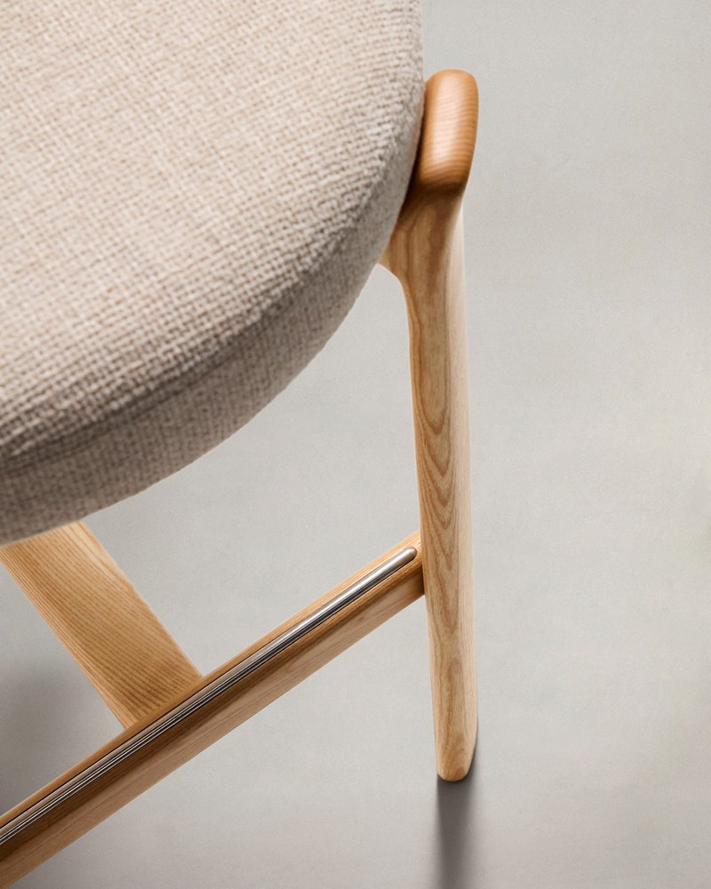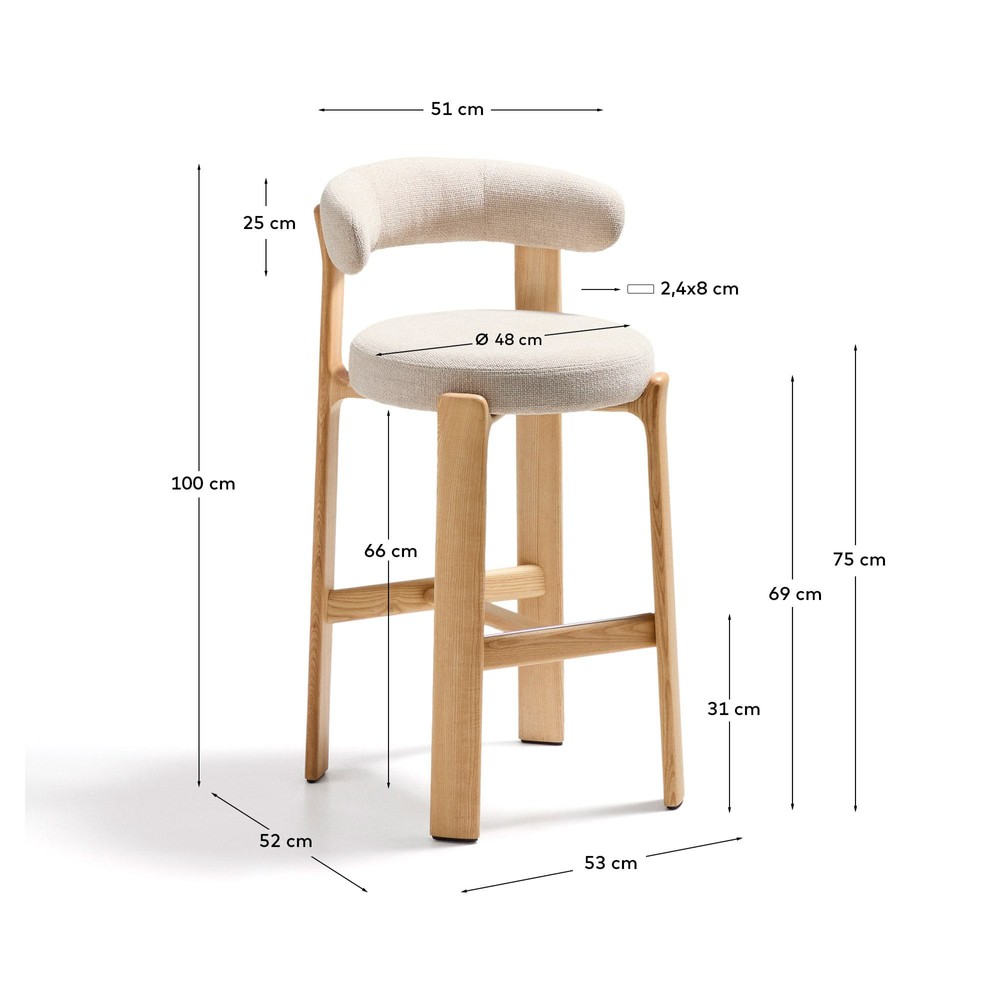 Dieser edle Hocker vereint natürliche Materialien, komfortable Polsterung und ein zeitloses Design zu einem Sitzmöbel, das jeden Raum bereichert. Mit seiner bequemen Rückenlehne und der angenehm gepolsterten Sitzfläche lädt er zum Verweilen ein – ob am Küchentresen, an der Hausbar oder im Essbereich. Die Polsterung aus formstabilem Polyurethanschaum sorgt für höchsten Sitzkomfort und dauerhafte Qualität. Sie bietet optimale Unterstützung und bleibt auch bei regelmäßiger Nutzung elastisch und widerstandsfähig. Der Bezug aus hochwertiger Chenille in sanftem Beige verleiht dem Hocker eine warme, einladende Optik und eine besonders weiche Haptik. Durch die dezent strukturierte Oberfläche entsteht ein edles, wohnliches Gesamtbild, das sich mühelos in verschiedenste Einrichtungsstile einfügt – von modern-minimalistisch bis hin zu skandinavisch-natürlich. Das Gestell aus massivem Eschenholz ist nicht nur äußerst stabil, sondern unterstreicht mit seinem naturfarbenen Finish den authentischen, hellen Charakter des Designs. Die feine Maserung des Holzes sorgt für eine natürliche Lebendigkeit und verleiht dem Möbelstück eine warme, handwerkliche Note. Eine praktische Fußstütze aus Holz bietet zusätzlichen Halt und rundet den Sitzkomfort harmonisch ab. Mit seinen Maßen von ca. 53 x 100 x 52 cm (Breite x Höhe x Tiefe) überzeugt der Hocker durch eine ausgewogene Form und angenehme Sitzhöhe – perfekt für hohe Esstische oder Bartresen. Ob als Einzelstück oder in Kombination mit mehreren Hockern, er setzt überall stilvolle Akzente und schafft eine Atmosphäre von Leichtigkeit und Behaglichkeit.