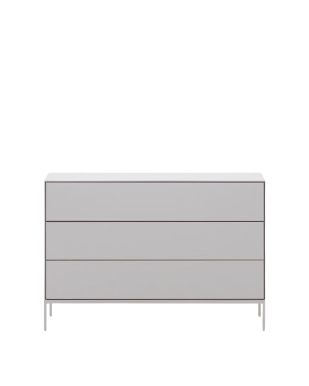 Diese Kommode ist die perfekte Kombination aus weißem Lack und Stahl und ein echter Hingucker. Sie verfügt über verstellbare Stahlbeine mit Finish in Mattweiß.  Das Möbelstück ist mit drei Schubladen mit versteckten, verstellbaren Schienen und Push-to-open-Mechanismus ausgestattet, welche zur Aufbewahrung von diversen Dingen dienen. Es bietet versteckte, verstellbare Schienen und Push-To-Open-Mechanismus.  Sie kann bei Bedarf mit einem feuchten Tuch und mildem Reinigungsmittel gereinigt werden.