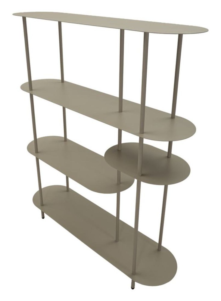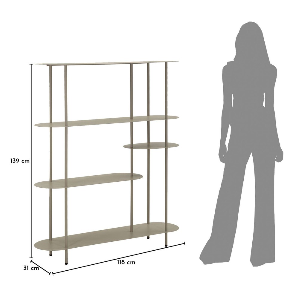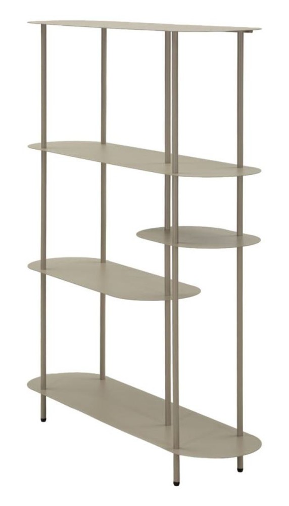 Dieses stilvolle Bücherregal überzeugt durch sein modernes Design und seine vielseitige Funktionalität. Gefertigt aus stabilem Metall und mit einem eleganten grauen Finish versehen, fügt sich das Regal harmonisch in unterschiedlichste Wohnstile ein – von modern und minimalistisch bis hin zu industriell inspirierten Einrichtungen. Dank seiner kompakten Größe eignet es sich ideal für Wohnzimmer, Schlafzimmer, Arbeitszimmer oder auch den Flur. Ein besonderes Merkmal des Regals ist die oben platzierte, abgerundete Ablagefläche, die dem Möbelstück eine weiche und moderne Optik verleiht. Die obere sowie die untere Ablage für ein interessantes, asymmetrisches Gesamtbild. Über der untersten Ablage befinden sich zwei weitere Platten, die dem Regal zusätzliche Ablagefläche bieten und gleichzeitig für ein dekoratives Design sorgen. Auf der linken Seite befindet sich eine etwas größere Ablagefläche, während darüber auf der rechten Seite eine kleinere Platte angebracht ist. Diese versetzte Anordnung schafft eine lebendige Optik und bietet verschiedene Möglichkeiten, Bücher, Pflanzen, Dekorationsobjekte oder kleine Alltagsgegenstände stilvoll zu präsentieren. Mit seinen Maßen von ca. 49,5 x 49,5 x 27,5 cm (Breite x Höhe x Tiefe) ist das Bücherregal besonders platzsparend und eignet sich hervorragend auch für kleinere Räume oder als dekorative Ergänzung zu bestehenden Möbeln. Die stabile Metallkonstruktion sorgt dabei für einen sicheren Stand und eine langlebige Nutzung. Ob als kleines Bücherregal, dekoratives Side-Regal oder praktische Ablagefläche – dieses Metallregal verbindet modernes Design mit funktionaler Vielseitigkeit