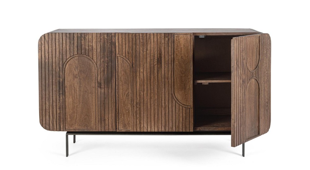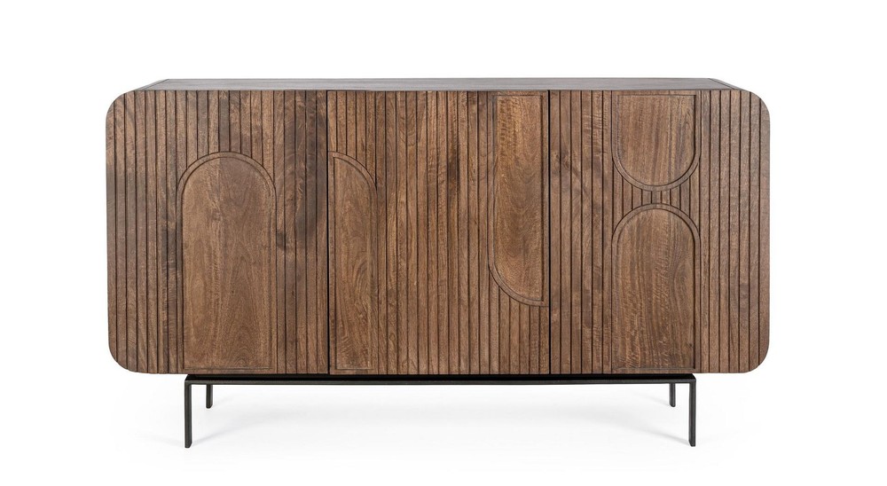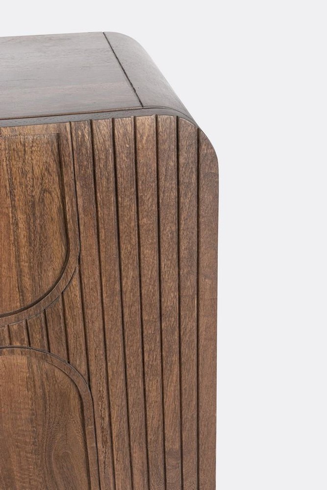 Modern und wunderschön. Dieses außergewöhnliche Sideboard vereint natürliche Materialien, meisterhafte Verarbeitung und ein ausdrucksstarkes Design zu einem Möbelstück, das in jedem Raum zum Statement wird. Gefertigt aus massivem Mangoholz mit einer fein abgestimmten Lackierung aus Nitrocellulose, besticht es durch seine Farbgebung, edle Oberfläche und die unverwechselbare Struktur des Holzes. Das Frontdesign ist ein wahres Kunstwerk. Feine vertikale Linien treffen auf harmonisch geschwungene Reliefmuster, die dem Möbel Tiefe und Charakter verleihen.