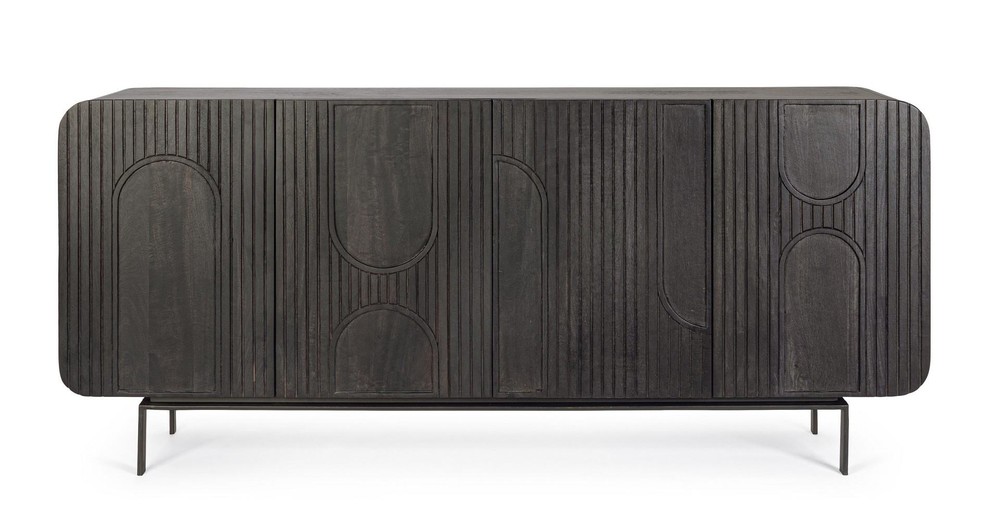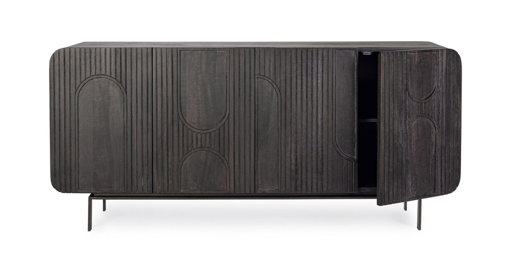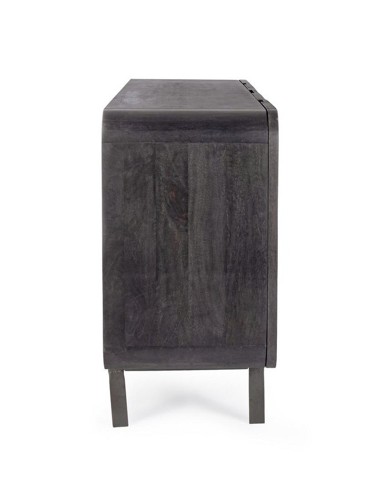 Modern und wunderschön. Dieses außergewöhnliche Sideboard vereint natürliche Materialien, meisterhafte Verarbeitung und ein ausdrucksstarkes Design zu einem Möbelstück, das in jedem Raum zum Statement wird. Gefertigt aus massivem Mangoholz mit einer fein abgestimmten Lackierung aus Nitrocellulose, besticht es durch seine tiefdunkle, edle Oberfläche und die unverwechselbare Struktur des Holzes.