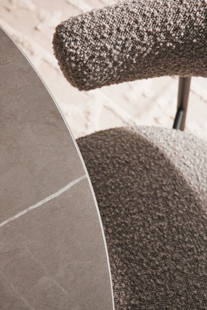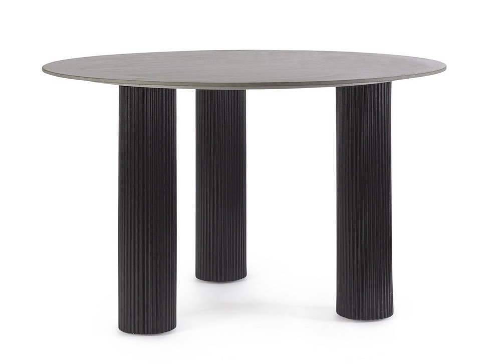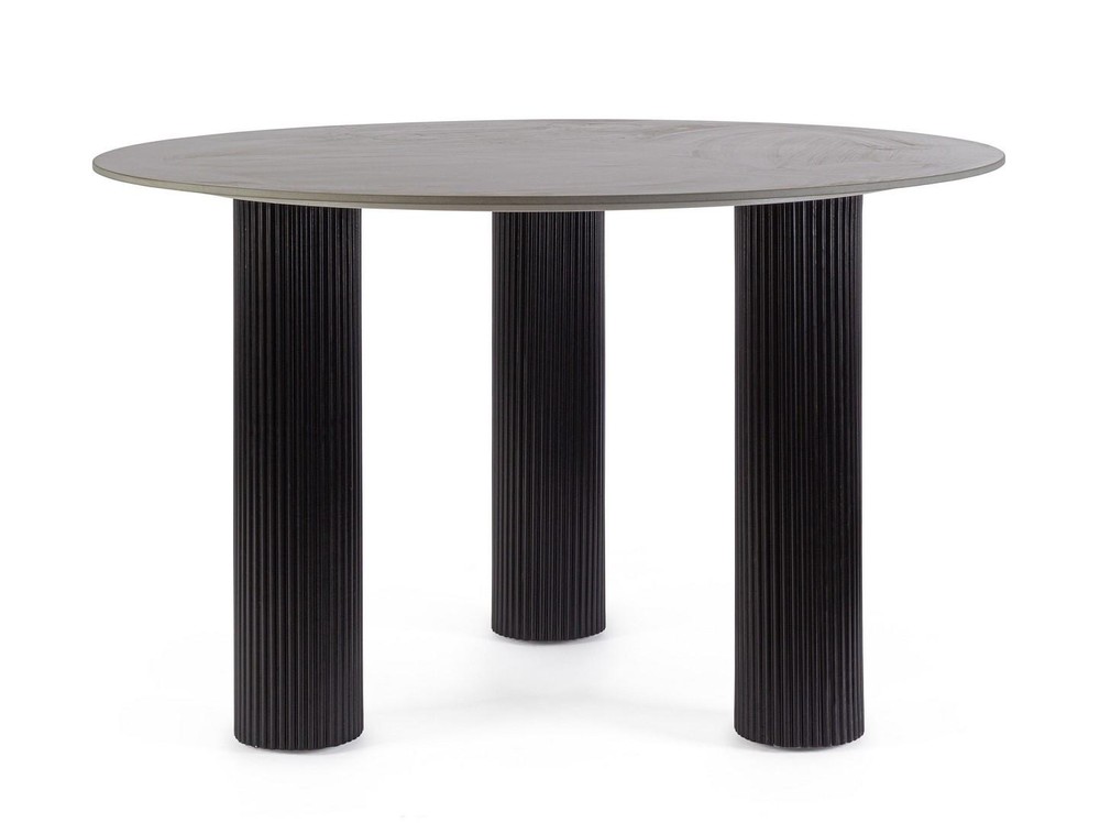 Mit seinem markanten Erscheinungsbild, der raffinierten Materialkombination und der klaren Formensprache ist dieser runde Esstisch ein echtes Statement-Piece für stilvolle Wohn- und Essbereiche. Die Verbindung aus einer elegant gemaserten Tischplatte in schwarzer Marmor-Optik und einem ausdrucksstarken Sockel mit Rippenstruktur verleiht dem Tisch eine skulpturale Präsenz, die modernes Design und zeitlose Eleganz perfekt vereint. Die runde Tischplatte besteht aus widerstandsfähigem Feinsteinzeug – einem Material, das sowohl durch seine Optik als auch durch seine Alltagstauglichkeit überzeugt. In einem tiefen Schwarz mit feinen, marmorierten Strukturen gestaltet, erinnert sie an hochwertigen Naturstein, ist dabei jedoch deutlich pflegeleichter, kratzfest und hitzebeständig. Die glatte, leicht matte Oberfläche verleiht dem Tisch eine luxuriöse Anmutung, die ihn zum Blickfang in jedem Raum macht. Das Gestell des Tisches ist mehr als nur ein funktionales Element – er ist Teil des Designs. Gefertigt aus stabilem MDF, besticht er durch seine umlaufende Rippenstruktur, die dem Tisch Tiefe, Rhythmus und ein markantes Profil verleiht. Das schwarze Finish unterstreicht die moderne Ästhetik und sorgt zugleich für einen harmonischen Übergang zur Tischplatte. Die strukturierte Oberfläche bringt subtile Dynamik ins Spiel und macht den Tisch aus jeder Perspektive interessant. Ein praktisches Detail sind die verstellbaren Füße am Boden des Sockels, die einen stabilen Stand auch auf leicht unebenem Untergrund ermöglichen – ideal für unterschiedlich beschaffene Bodenbeläge. Mit einem Durchmesser von etwa 120 Zentimetern und einer Höhe von rund 76 Zentimetern bietet der Tisch komfortabel Platz für bis zu vier Personen. Die runde Form fördert ein kommunikatives Miteinander und eignet sich perfekt für gesellige Abende, Frühstücksrunden oder als stilvoller Mittelpunkt eines offenen Wohnraums.