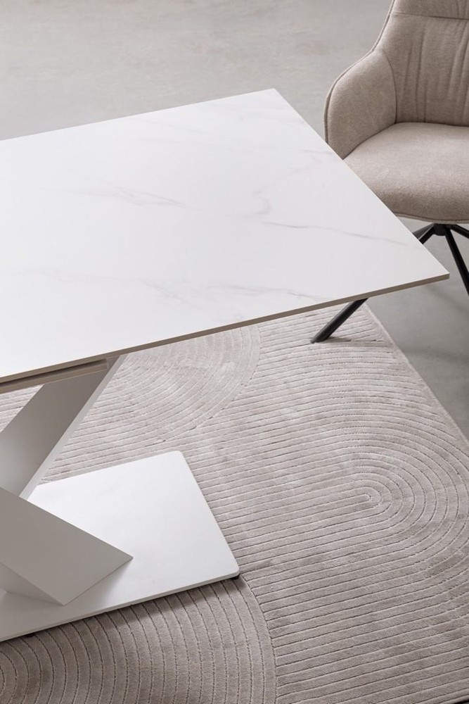 Modern und wunderschön. Stellen Sie sich einen Ort vor, an dem Natürlichkeit und Wärme Zuhause sind. Er verbindet präzises Handwerk mit langlebigen Materialien, modernes Design mit klarer Formensprache. Das klare, geometrische Gestell verleiht dem Tisch moderne Linienführung. Perfekt vereinte Ästhetik und Praktikabilität. Ob in der Küche, im Essbereich oder im Wohnbereich, dieser Tisch wird schnell zum Mittelpunkt jeder geselligen Runde. Ein Tisch, der mehr ist als nur ein Möbelstück. Die kühle, präzise Struktur des Metalls harmoniert mit der natürlichen Schönheit der Steinzeugplatte, gerade durch den Marmoreffekt entsteht ein edler, fast luxuriöser Eindruck.