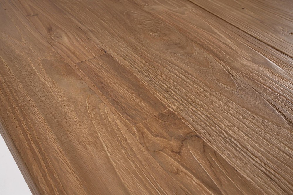 Stellen Sie sich einen Ort vor, an dem Natürlichkeit und Wärme Zuhause sind. Dieser elegante Tisch vereint modernes Design, natürliche Materialien und praktische Funktionalität. Die Tischplatte aus recyceltem Teakholz besticht durch ihre natürliche Holz-Optik, die warme, wohnliche Akzente in jeden Raum bringt. Die feine Struktur und das realistische Holzdekor verleihen der Oberfläche ein authentisches Erscheinungsbild, das Natürlichkeit und zeitlose Eleganz vereint.