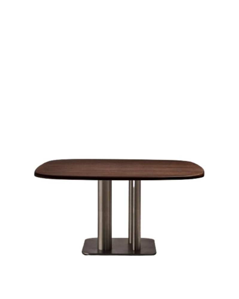 Dieser hochwertige Tisch vereint natürliche Eleganz mit moderner Fertigungstechnologie und wird zum stilvollen Mittelpunkt Ihres Wohn- oder Arbeitsbereichs. Die Tischplatte besteht aus robustem Eukalyptusholz und ist mit edlem Walnussfurnier veredelt. Das dunkle Finish betont die ausdrucksstarke Maserung und verleiht dem Tisch eine warme, zeitlose Ausstrahlung, die sich harmonisch in verschiedenste Einrichtungsstile einfügt – von modern bis klassisch. Das Furnierholz wird mithilfe einer Membranpresse präzise gebogen. Dieses Verfahren sorgt nicht nur für eine elegante Linienführung, sondern gewährleistet zugleich eine hohe Formstabilität. Durch das zusätzliche Polyurethan-Finish erhält die Oberfläche noch mehr Stärke und Widerstandsfähigkeit. So profitieren Sie von einer langlebigen, pflegeleichten Tischplatte, die den täglichen Anforderungen problemlos standhält und dauerhaft ihre hochwertige Optik bewahrt. Mit seiner großzügigen Fläche bietet der Tisch bequem Platz für bis zu vier Personen. Ob gemeinsames Essen, produktive Besprechungen oder gesellige Abende – Sie genießen stets ausreichend Raum und Komfort. Die Edelstahlbeine in gebürsteter Optik setzen einen modernen Akzent und unterstreichen das klare Design. Dank der unterschiedlichen Durchmesser entsteht eine spannende, zeitgemäße Formensprache. Gleichzeitig reduziert die gebürstete Oberfläche die Sichtbarkeit von Fingerabdrücken und sorgt so für ein dauerhaft gepflegtes Erscheinungsbild. Ein weiterer Vorteil ist der verstellbare Unterbau. Damit können Sie eventuelle Bodenunebenheiten einfach ausgleichen und jederzeit einen stabilen, sicheren Stand gewährleisten. Dieser Tisch überzeugt durch die gelungene Verbindung aus hochwertigen Materialien, präziser Verarbeitung und funktionaler Ausstattung – ein Möbelstück, das Design, Komfort und Langlebigkeit auf anspruchsvolle Weise miteinander vereint.