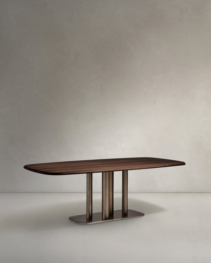 Dieser exklusive Tisch verbindet anspruchsvolles Design mit hochwertiger Handwerkskunst und durchdachter Funktionalität. Mit seinen großzügigen Maßen von ca. 180 x 100 x 74 cm (Länge x Breite x Höhe) wird er zum stilvollen Mittelpunkt Ihres Ess- oder Konferenzbereichs und bietet komfortabel Platz für bis zu acht Personen – ideal für gesellige Abende, Familienfeiern oder produktive Meetings. Die Tischplatte besteht aus massivem Eukalyptusholz und ist mit edlem Walnussfurnier veredelt. Das dunkle Finish bringt die natürliche Maserung eindrucksvoll zur Geltung und verleiht dem Tisch eine warme, elegante Ausstrahlung. Die harmonische Kombination aus natürlicher Holzoptik und tiefem Farbton sorgt für eine zeitlose Ästhetik, die sich sowohl in moderne als auch in klassische Interieurs nahtlos einfügt. Besondere Qualität zeigt sich in der Verarbeitung: Das Furnierholz wird mithilfe einer Membranpresse präzise gebogen. Dieses innovative Verfahren gewährleistet eine gleichmäßige Formgebung und hohe Stabilität. Zusätzlich sorgt ein widerstandsfähiges Polyurethan-Finish für mehr Stärke und Haltbarkeit. Die Oberfläche ist dadurch besonders robust, pflegeleicht und widerstandsfähig gegenüber alltäglichen Beanspruchungen – für langanhaltende Freude an Ihrem Möbelstück. Die Edelstahlbeine setzen einen modernen, architektonischen Akzent. Sie verfügen über unterschiedliche Durchmesser, was dem Tisch eine dynamische und zugleich elegante Optik verleiht. Die gebürstete Oberfläche reduziert sichtbar Fingerabdrücke und trägt zu einem dauerhaft gepflegten Erscheinungsbild bei. Gleichzeitig sorgt das stabile Metallgestell für eine zuverlässige Standfestigkeit. Ein weiterer praktischer Vorteil ist der verstellbare Unterbau. Damit können Sie Bodenunebenheiten problemlos ausgleichen und jederzeit einen sicheren, stabilen Stand gewährleisten – selbst auf anspruchsvollen Untergründen. Dieser Tisch überzeugt durch seine ausgewogenen Proportionen, hochwertige Materialien und langlebige Verarbeitung. Er vereint Komfort, Stabilität und zeitloses Design in einem Möbelstück, das sowohl optisch als auch funktional höchsten Ansprüchen gerecht wird.