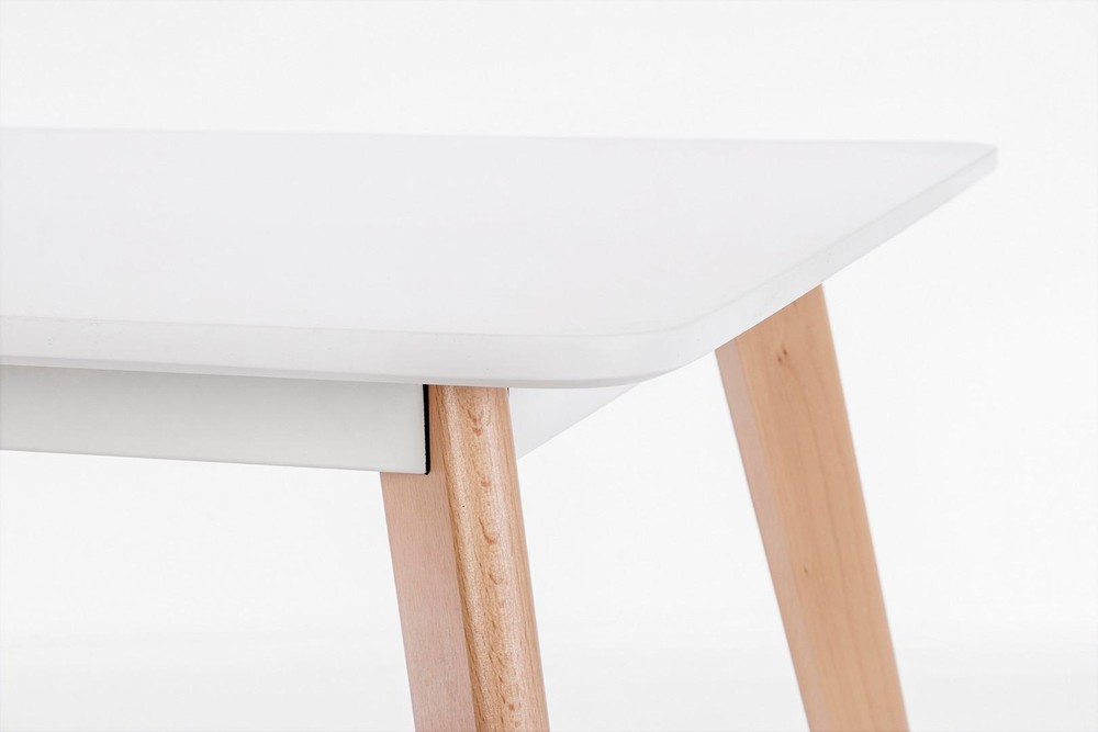 Dieser elegante Esstisch vereint zeitloses Design, hochwertige Materialien und praktische Funktionalität und wird so zum Mittelpunkt jedes Essbereichs. Die Tischplatte aus MDF ist mit einer weißen Mattlackierung versehen, die eine klare, moderne Optik schafft und gleichzeitig pflegeleicht sowie widerstandsfähig gegenüber Kratzern, Flecken oder Feuchtigkeit ist. Das matte Finish verleiht der Oberfläche ein edles, dezentes Erscheinungsbild, das sich harmonisch in unterschiedliche Wohnstile integrieren lässt. Die Beine aus Buchenholz mit natürlichem Finish bringen Wärme, Struktur und eine natürliche Ausstrahlung in den Raum. Die helle Holzfarbe kontrastiert elegant mit der weißen Platte und sorgt für ein modernes, skandinavisch inspiriertes Gesamtbild. Dank der hochwertigen Verarbeitung sind die Beine besonders stabil und langlebig, sodass der Tisch auch bei täglicher Nutzung zuverlässig überzeugt. Mit den Maßen von ca. 120 x 80 x 74 cm (L x B x H) bietet der Tisch ausreichend Platz für bis zu vier Personen – ideal für gemütliche Familienessen, Frühstücksrunden oder gesellige Abende mit Freunden.