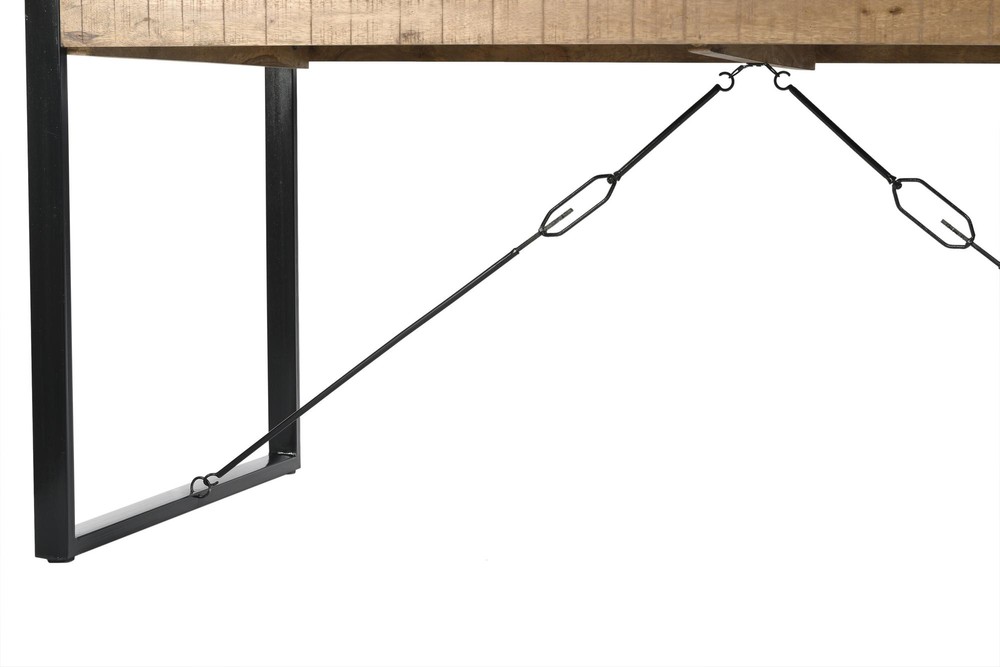 Dieser einzigartige Tisch verbindet modernes Industriedesign mit natürlicher Holzoptik und wird so zu einem stilvollen Blickfang in jedem Wohn- oder Essbereich. Die Tischplatte aus Mangoholz mit natürlichem Finish besticht durch ihre warme Farbgebung und die charakteristische Maserung, die jedes Möbelstück zu einem individuellen Unikat macht. Das natürliche Finish hebt die Struktur des Holzes hervor und verleiht dem Tisch zugleich eine elegante, zeitlose Ausstrahlung. Das stabile Gestell aus Stahl mit schwarzem Finish sorgt für Langlebigkeit und Stabilität, während die klaren Linien des Metallrahmens für einen modernen, minimalistischen Charakter stehen. Zwei Seile, die jeweils den unteren Teil der Beine mit der Tischplatte verbinden, setzen dabei einen besonderen Designakzent und verleihen dem Tisch zugleich zusätzliche Stabilität. Diese Kombination aus Metall, Holz und Seil schafft einen spannenden Kontrast zwischen natürlicher Wärme und industrieller Klarheit. Mit den Maßen von ca. 160 x 90 x 76 cm (L x B x H) bietet der Tisch ausreichend Platz für Familienessen, gesellige Runden oder Arbeitsbereiche. Die großzügige Tischfläche ermöglicht eine offene und einladende Sitzordnung, während die stabile Konstruktion für sichere Nutzung im Alltag sorgt. Mangoholz ist nicht nur optisch ansprechend, sondern auch robust und pflegeleicht. Das natürliche Finish schützt die Oberfläche, bewahrt die Holzstruktur und garantiert, dass der Tisch über viele Jahre hinweg seine Schönheit behält. Dieser Tisch ist mehr als nur ein Möbelstück: Er vereint hochwertige Materialien, kreatives Design und durchdachte Funktionalität zu einem Blickfang, der jedem Raum Stil, Natürlichkeit und eine besondere Atmosphäre verleiht. Ob im Esszimmer, in der Küche oder als markantes Highlight im Arbeitsbereich – dieser Tisch setzt Akzente und bietet gleichzeitig praktischen Nutzen.