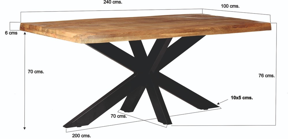 Dieser elegante Tisch verbindet die natürliche Schönheit von Mangoholz mit modernem, industriellem Design und wird so zum markanten Mittelpunkt in jedem Ess- oder Wohnbereich. Die Tischplatte aus Mangoholz besticht durch ihr warmes, natürliches Finish und die charakteristische Maserung, die jedes Möbelstück zu einem individuellen Einzelstück macht. Die Oberfläche strahlt Wärme und Natürlichkeit aus und verleiht dem Tisch eine hochwertige, zeitlose Optik. Das stabile Gestell besteht aus gekreuzten Beinen aus Stahl mit schwarzem Finish, die dem Tisch nicht nur eine moderne, industrielle Note verleihen, sondern auch für außergewöhnliche Stabilität und Langlebigkeit sorgen. Die Kombination aus warmem Holz und kühlem Metall erzeugt einen ansprechenden Kontrast, der sich harmonisch in unterschiedliche Einrichtungsstile einfügt – von modern über skandinavisch bis hin zu rustikal oder loftartig-industriell. Mit den Maßen von ca. 240 x 100 x 76 cm (L x B x H) bietet der Tisch großzügig Platz für gesellige Runden, Familienessen oder Dinner mit Freunden. Die rechteckige Form ermöglicht eine flexible Nutzung, schafft eine einladende Atmosphäre und sorgt dafür, dass jeder Gast bequem Platz findet. Mangoholz ist nicht nur optisch ansprechend, sondern auch besonders robust und pflegeleicht. Das natürliche Finish schützt die Oberfläche, bewahrt die Holzstruktur und sorgt dafür, dass der Tisch über viele Jahre hinweg seine Schönheit behält. Dieser Tisch ist mehr als nur ein funktionales Möbelstück: Er vereint hochwertige Materialien, durchdachtes Design und praktische Funktionalität zu einem stilvollen Mittelpunkt, der jedem Raum Wärme, Natürlichkeit und Eleganz verleiht. Ob im Esszimmer, in der offenen Küche oder als repräsentativer Tisch im Wohnbereich – dieses Möbelstück zieht alle Blicke auf sich und schafft ein gemütliches, einladendes Ambiente.