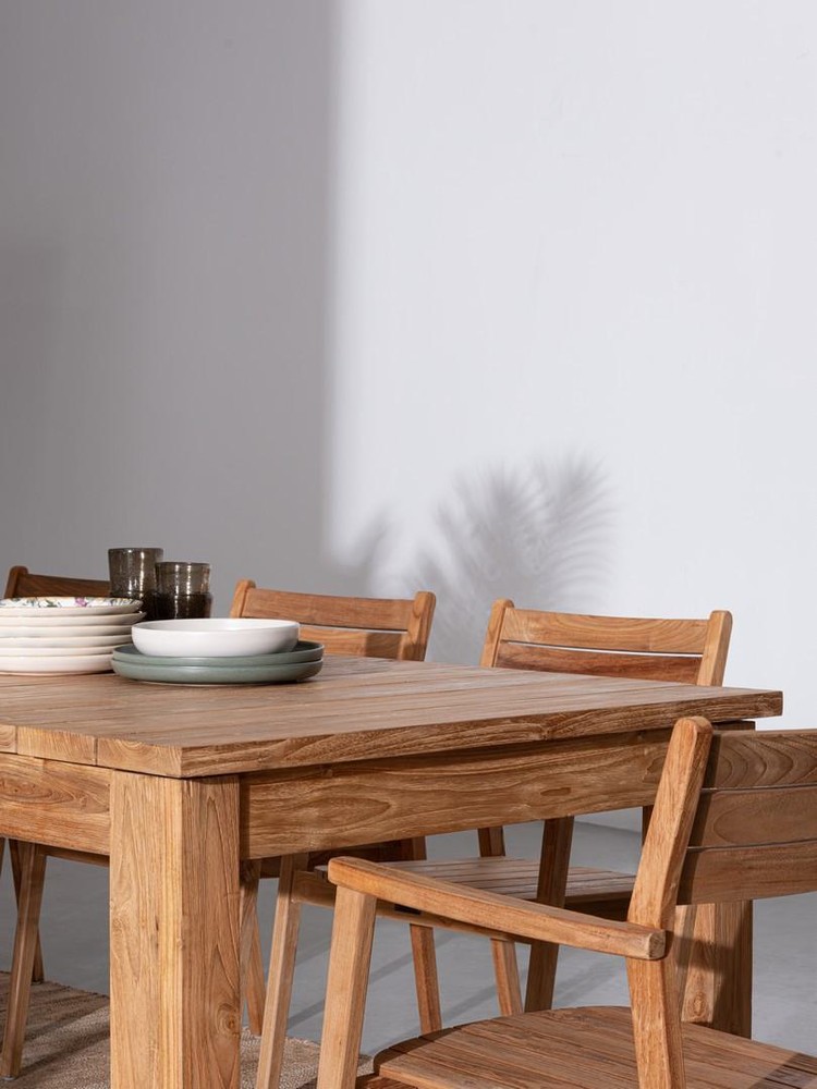 Stellen Sie sich einen Ort vor, an dem Natürlichkeit und Wärme Zuhause sind. Dieser elegante Tisch vereint modernes Design, natürliche Materialien und praktische Funktionalität. Die Tischplatte aus recyceltem Teakholz besticht durch ihre natürliche Holz-Optik, die warme, wohnliche Akzente in jeden Raum bringt. Die feine Struktur und das realistische Holzdekor verleihen der Oberfläche ein authentisches Erscheinungsbild, das Natürlichkeit und zeitlose Eleganz vereint. Dieser Esstisch aus recyceltem Teakholz erzählt mit jedem Ast und jeder Jahresringe seine ganz eigene Geschichte.