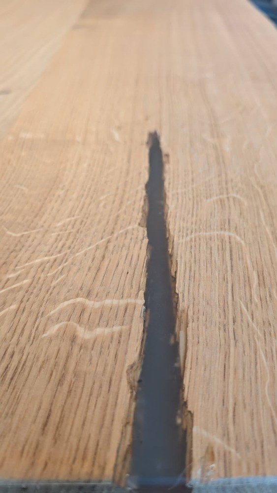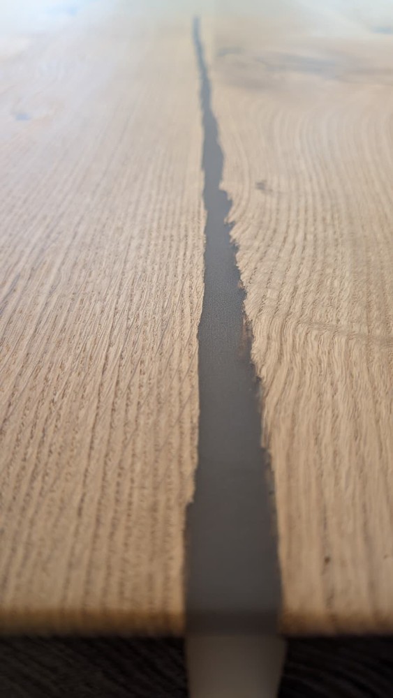 Die Risse und Äste der Eiche wurden mit einem klaren, transzendenten Epoxidharz ausgegossen, das das Holz nicht nur schützt, sondern auch die natürliche Schönheit und Textur des Materials auf elegante Weise betont. Das Harz gleicht etwaige Unregelmäßigkeiten aus und lässt die Holzstruktur in faszinierenden Kontrasten und Transparenzen erstrahlen, was jede Platte zu einem echten Unikat macht.