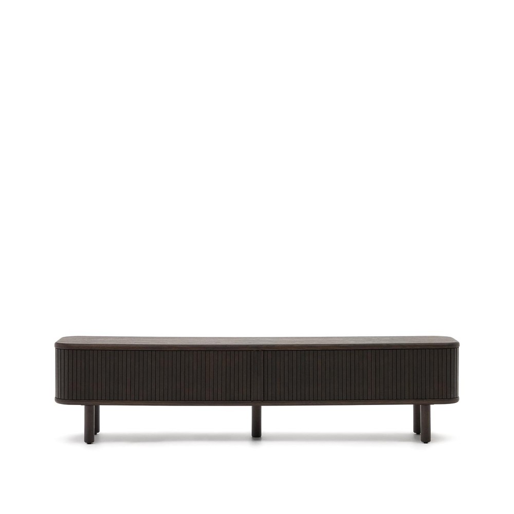 Dieses TV-Möbel ist ein Highlight im puncto Design. Es zeichnet sich durch seine abgerundeten Formen aus dunklem Eschenfurnier und zwei Holzlamellen- Schiebetüren aus. Es verleiht Ihren Innenräumen eine moderne und dennoch warme Ausstrahlung. Mit zwei Schiebetüren und vier Fächer bietet das TV-Möbel praktischen Stauraum für die ordentliche Aufbewahrung verschiedener Gegenstände. Zudem verfügt das Möbelstück über verstellbare Beine und Kunststoffpolster an Füßen. Die Maße 200 x 40 cm bieten genügend Ablagefläche für alles Mögliche. Von Deko-Artikeln bis hin zu nützlichem Equipment. Mit einer Höhe von 50 cm ist dieses Möbelstück vielseitig einsetzbar. Das Möbelstück ist eine stilvolle Ergänzung für Ihr Zuhause.