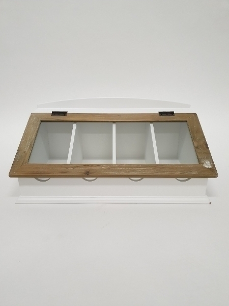 Der Besteckkasten Provence ist aus MDF und Farben Holz und Weiß Antik. Er hat 4 Fächer zur Aufbewahrung und einen Glasdeckel mit Holzrahmen. Oben sieht man durch den Glasdeckel auch sofort den Inhalt dieser Fächer. Im trendigen Landhausstil gefertigt ist dieser Aufbewahrungskasten ein sehr praktisches und reizvolles Accesoire für ihre 4 Wände.