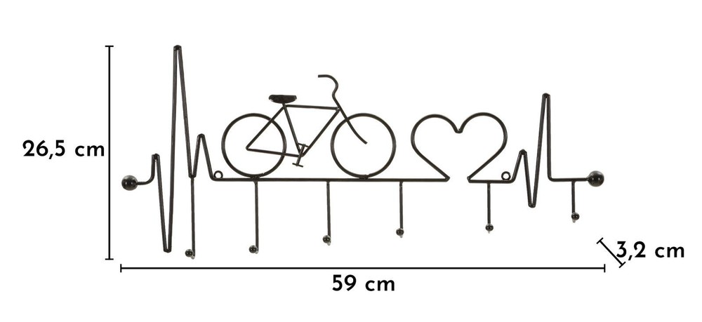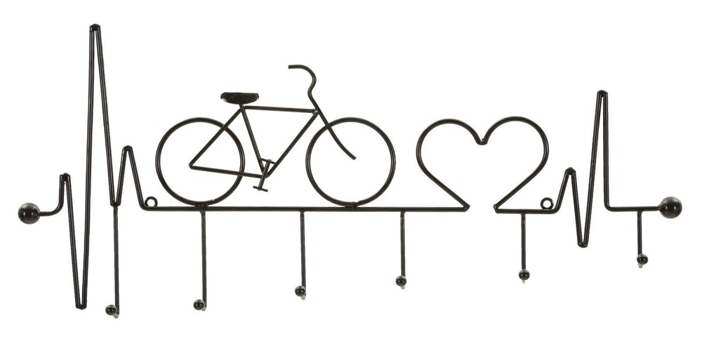 Verleihen Sie Ihrem Eingangsbereich oder Flur eine besondere Note mit diesem einzigartigen Hängeelement. Die Garderobe besteht aus robustem Metall mit elegantem schwarzen Finish und überzeugt nicht nur durch ihre Stabilität, sondern auch durch ihr kreatives Design. Die sechs praktischen Haken bieten ausreichend Platz, um Jacken, Schals, Taschen oder Accessoires übersichtlich und griffbereit aufzuhängen. Das Highlight der Garderobe ist das kunstvolle Motiv: Die schwarze Metallstruktur bildet ein stilisiertes Fahrrad auf einer Herzlinie ab – ein Symbol für Energie, Bewegung und Lebensfreude. So wird die Garderobe nicht nur funktional, sondern auch zu einem dekorativen Blickfang, der jedem Raum Persönlichkeit verleiht. Mit den kompakten Maßen von ca. 59 x 26,5 x 3,2 cm lässt sich das Hängeelement flexibel platzieren, ohne wertvollen Raum zu beanspruchen. Ob im Flur, im Kinderzimmer oder als originelles Detail im Wohnbereich – dieses Garderoben-Hängeelement verbindet praktischen Nutzen mit kreativem Design und sorgt für einen stilvollen Empfang.
