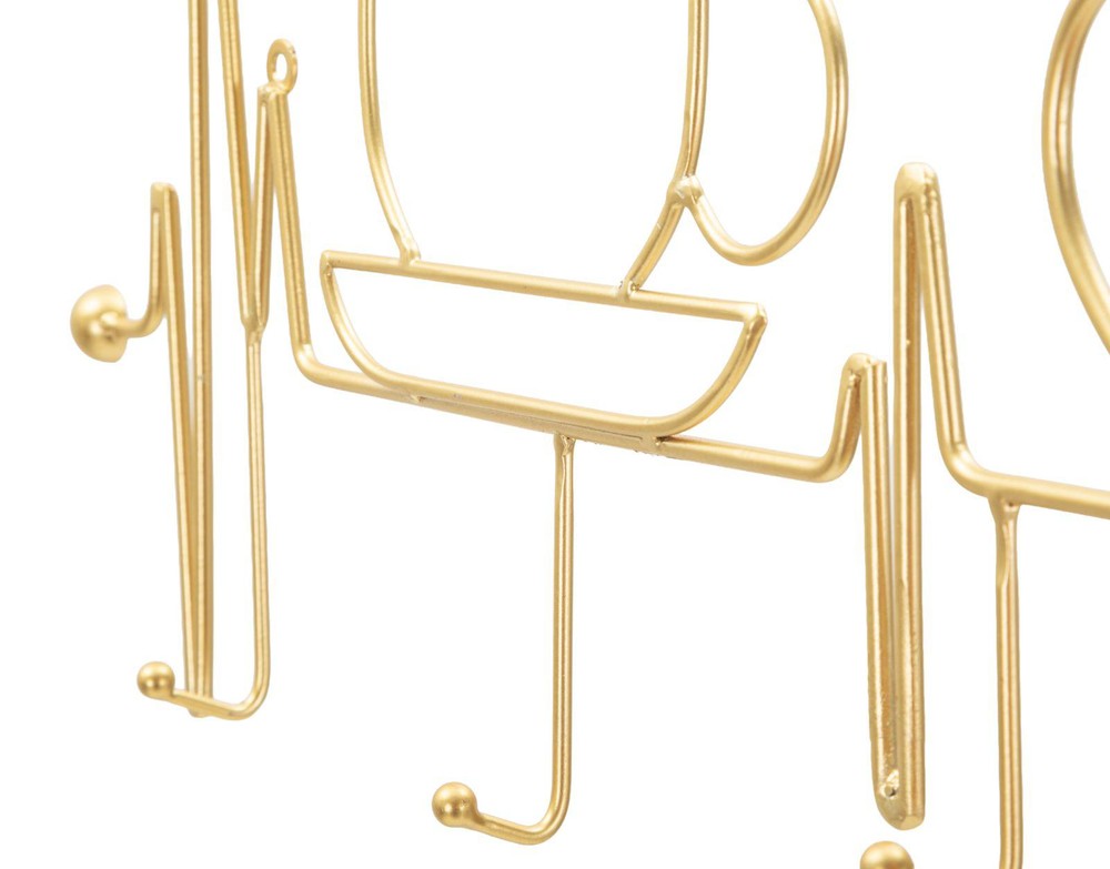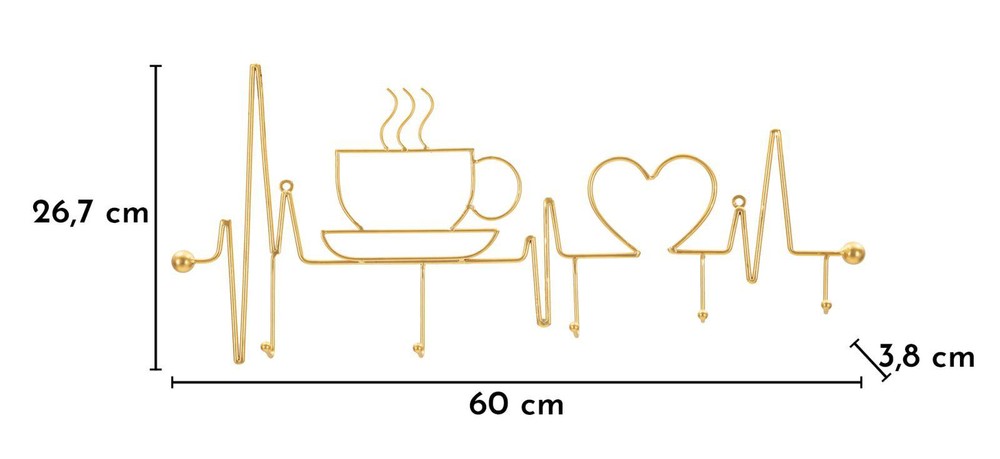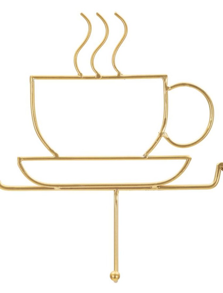 Verleihen Sie Ihrem Eingangsbereich oder Flur einen Hauch von Eleganz und Funktionalität mit diesem stilvollen Hängeelement aus Metall in edlem Gold-Finish. Die fünf stabilen Haken bieten praktischen Platz für Jacken, Schals, Taschen oder Accessoires und halten Ihren Alltag organisiert, ohne dabei Kompromisse beim Design einzugehen. Das besondere Highlight ist das kunstvolle Motiv: Das goldene Metall zieht eine dampfende Tasse entlang einer stilisierten Herzlinie und erinnert an entspannte Momente bei einer Tasse Kaffee oder Tee – eine charmante Einladung zu Ruhe, Gemütlichkeit und Geselligkeit in Ihrem Zuhause. Die harmonische Verbindung von Symbolik und klarer Linienführung macht dieses Hängeelement zu einem dekorativen Blickfang, der Funktionalität und Ästhetik perfekt vereint. Mit den Maßen von ca. 60 x 26,7 x 3,8 cm fügt sich die Garderobe unaufdringlich in nahezu jeden Raum ein und setzt gleichzeitig einen feinen, luxuriösen Akzent. Ob im Flur, neben der Haustür oder in der Küche – dieses Hängeelement verbindet praktische Ordnung mit künstlerischem Design und macht den Alltag stilvoller.