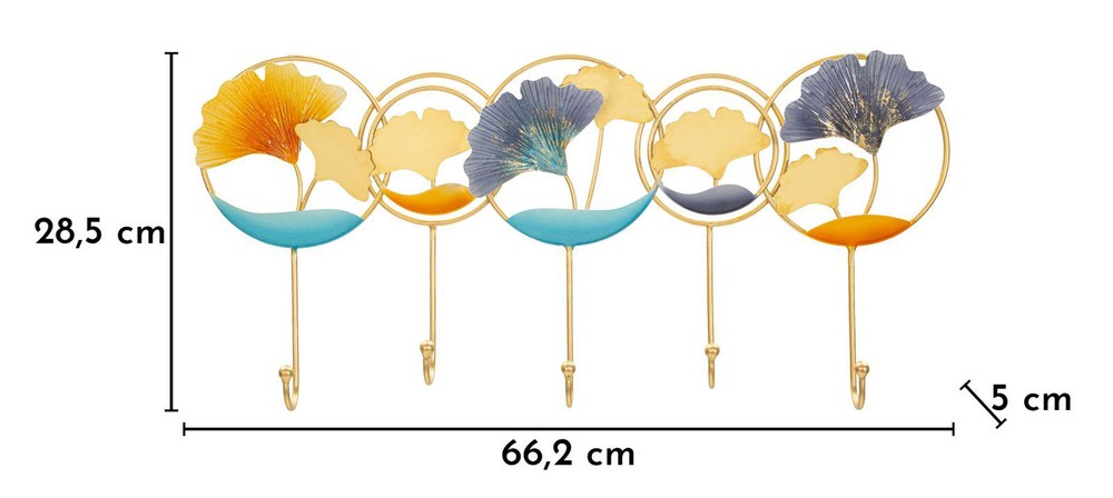 Setzen Sie ein lebendiges Design-Statement in Ihrem Eingangsbereich oder Flur mit diesem einzigartigen Hängeelement aus Metall in edlem Gold-Finish. Die fünf stabilen Haken bieten praktischen Platz für Jacken, Taschen oder Accessoires und verbinden so Funktionalität mit dekorativem Flair. Das runde, geometrische Design wird durch farbenfrohe Scheiben und feine goldene Details zum echten Blickfang. Die harmonische Mischung aus warmen und kühlen Farbtönen erzeugt eine sonnige, lebendige Komposition, die jedem Raum Persönlichkeit, Bewegung und Dynamik verleiht. So wird selbst der schlichteste Flur zu einer inspirierenden Fläche voller Stil und Originalität. Mit den Maßen von ca. 60,2 x 28,5 x 5 cm fügt sich das Hängeelement flexibel in unterschiedliche Raumgrößen ein, ohne dabei aufzufallen – und dennoch zieht es alle Blicke auf sich. Ob im Eingangsbereich, im Schlafzimmer oder in der Küche, diese Garderobe verbindet praktische Ordnung mit künstlerischem Design und verleiht Ihren Wänden eine besondere Note.