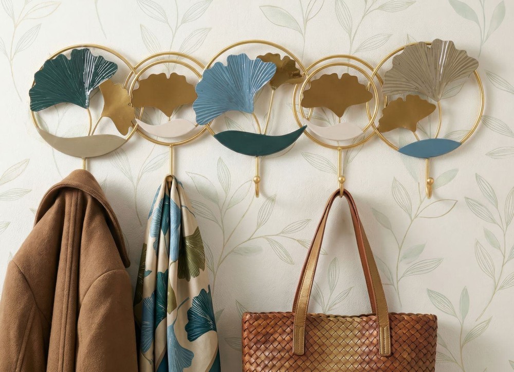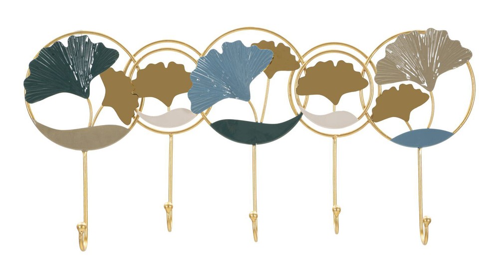 Bringen Sie Eleganz und künstlerische Raffinesse in Ihr Zuhause mit diesem exklusiven Garderoben-Hängeelement aus Metall in edlem Gold-Finish. Die fünf stabilen Haken bieten praktischen Platz für Jacken, Taschen, Schals oder Accessoires und verbinden Funktionalität auf stilvolle Weise mit dekorativem Design. Das Hängeelement besticht durch sein rundes, geometrisches Design und die filigranen dekorativen Elemente in Form von Ginkgo-Blättern. Die harmonische Farbgestaltung in Gold-, Blau- und Silbertönen erzeugt ein feines, natürliches Spiel aus Licht und Schatten und verleiht Ihrem Raum eine elegante, künstlerische Note. Das Ergebnis ist ein Möbelstück, das sowohl praktisch als auch ein echter Blickfang ist – perfekt, um Eingänge, Zimmer oder Wohnbereiche zu verschönern. Mit den Maßen von ca. 60,2 x 28,5 x 5 cm fügt sich die Garderobe unaufdringlich in verschiedenste Raumgrößen ein und setzt gleichzeitig einen dekorativen Akzent. Ob allein platziert oder als Teil einer stilvollen Wandgestaltung – dieses Hängeelement vereint hochwertige Materialien, durchdachte Details und künstlerisches Design zu einem einzigartigen Wohnaccessoire.