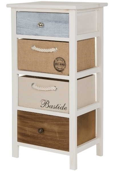 Die Kommode Eliza ist aus MDF und in Bunt. Korpus Weiß, Schubladen in verschiedenen Farben. Sie hat drei Schubladen. Zwei davon ohne Aufdruck und mit Knopfgriffen aus Metall, die anderen beiden mit Aufdruck und Seilgriffen. Ein wirklich besonderes Stück im klassischen Landhausstil für ihr Zuhause.