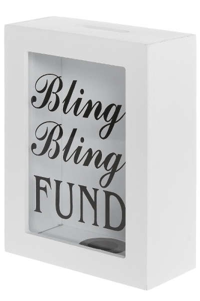 Die Spardose Solara ist aus MDF und in Farbe Weiß. Sie hat ein praktisches Sichtfenster, Einwurfschlitz oben und einen Stöpsel zur Entleerung unten. Der Aufdruck Bling Bling Fund macht die Spardose zu einem praktischen und dekorativen Accesoire im modernen Stil bei ihnen zuhause.