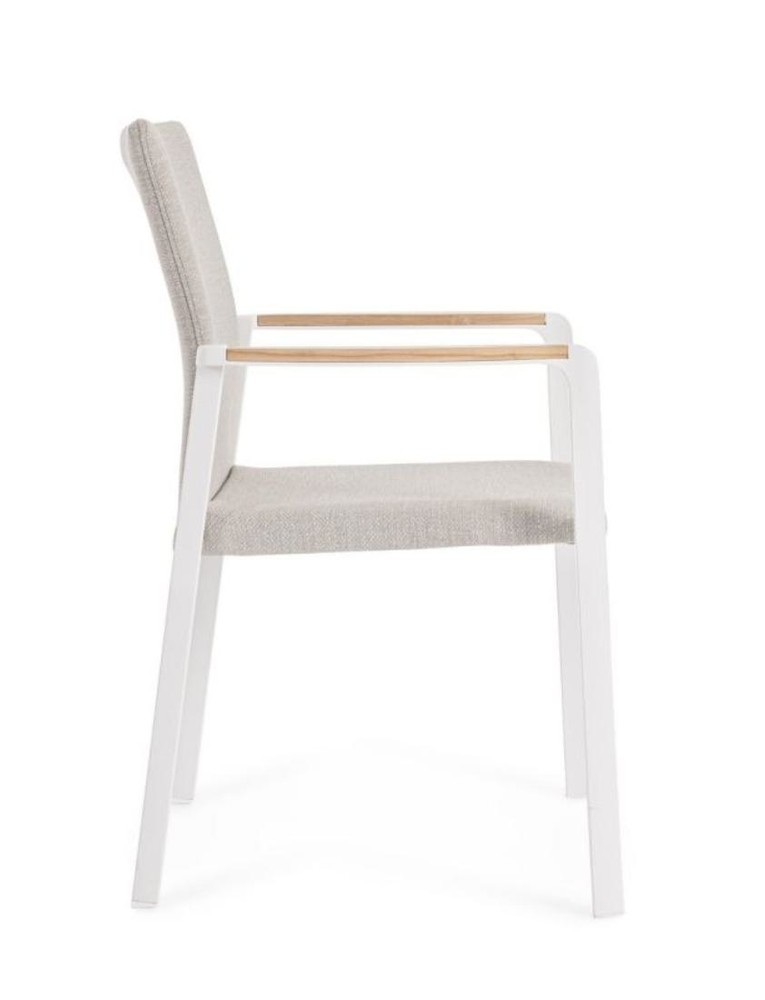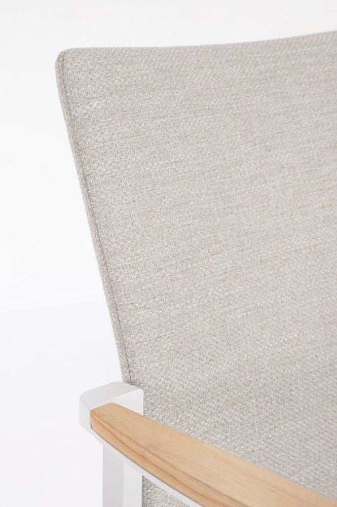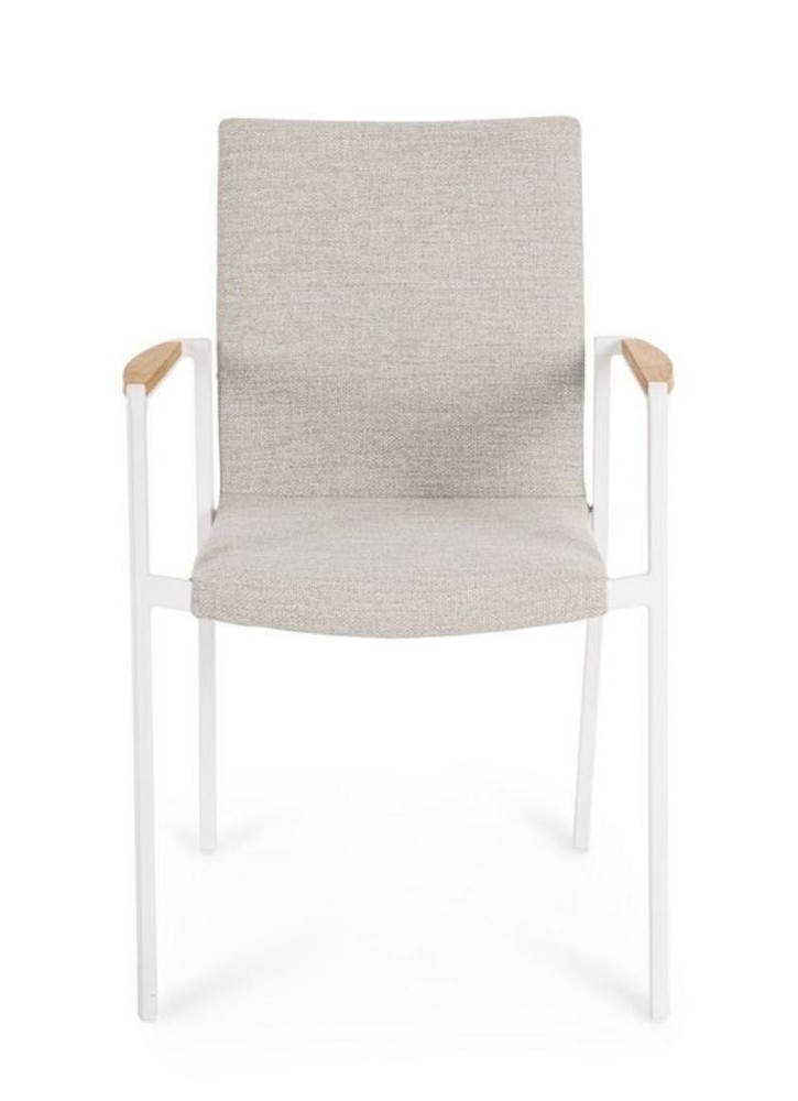 Erleben Sie elegantes Design, hohen Komfort und durchdachte Funktionalität mit diesem Set aus vier hochwertigen Stühlen, das sich perfekt für moderne Innen- und Außenbereiche eignet. Das stabile Gestell aus pulverbeschichtetem Aluminium in strahlendem Weiß überzeugt durch Leichtigkeit, Langlebigkeit und hervorragende Witterungsbeständigkeit. Die klare Linienführung und das zeitlose Finish verleihen den Stühlen eine elegante, stilvolle Ausstrahlung, die sich mühelos in unterschiedliche Wohn- und Gartenkonzepte einfügt. Ein besonderes Highlight sind die Armlehnen mit Einsätzen aus Eichenholz, die nicht nur für eine natürliche, warme Optik sorgen, sondern gleichzeitig robust und angenehm in der Haptik sind. Die Kombination aus Aluminium und Holz schafft ein harmonisches Zusammenspiel aus Modernität und Natürlichkeit. Für höchsten Sitzkomfort sorgt die Rückenlehne aus wasserabweisendem Olefin-Gewebe (Polypropylen) in Beige, die sich flexibel an die Rückenform anpasst und eine angenehme Belüftung bietet. Ergänzt wird der Komfort durch die Polsterung aus Fast Dry Foam, die besonders schnell trocknet und langlebig ist – ideal für den Einsatz im Außenbereich, selbst bei gelegentlicher Feuchtigkeit. Die Stühle sind zudem stapelbar, sodass Sie sie bei Nichtgebrauch platzsparend aufbewahren können. Das erleichtert die flexible Nutzung auf Terrasse, Balkon oder im Essbereich und sorgt für Ordnung und Übersichtlichkeit. Mit Maßen von ca. 60,5 cm Breite, 89 cm Höhe und 59 cm Tiefe bieten die Stühle eine großzügige, ergonomische Sitzfläche und laden zu entspannten Stunden ein. Dieses vierteilige Stuhlset ist die ideale Wahl für Sie, wenn Sie Wert auf modernes Design, hochwertige Materialien, außergewöhnlichen Komfort und vielseitige Einsatzmöglichkeiten legen.