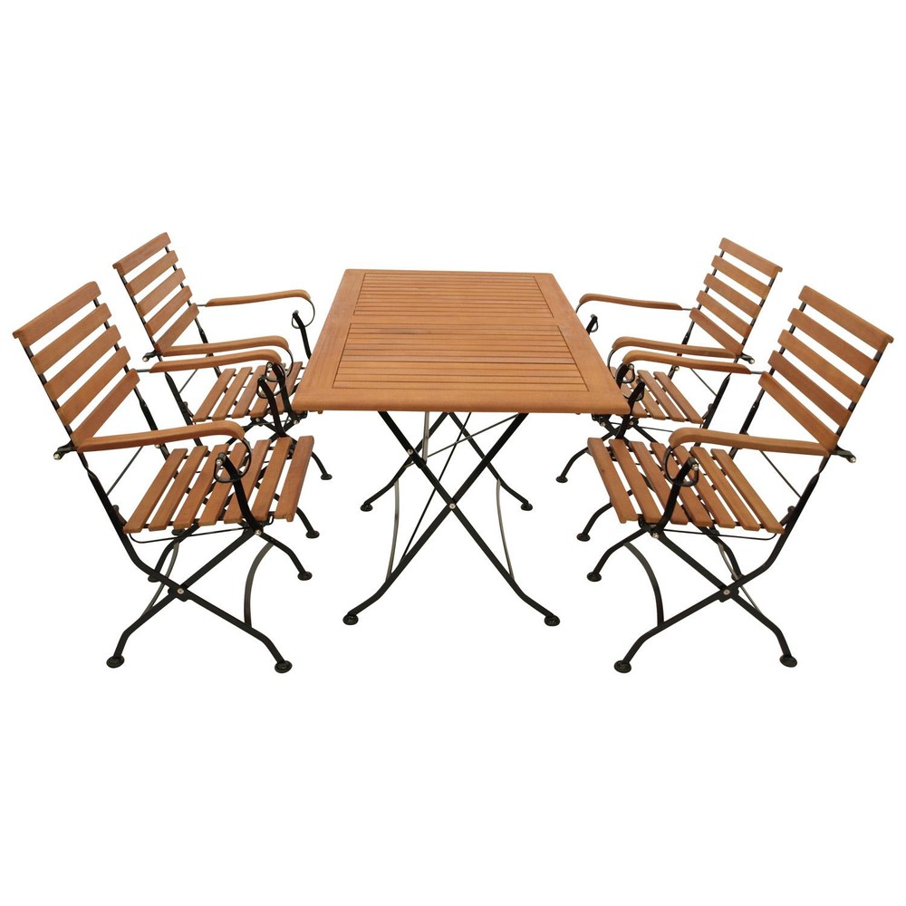 Diese 5-teilige Garnitur aus Eukalyptus und Flachstahl, bietet nicht nur einen hohen Komfort, sondern auch ein rustikales Design und Funktionalität durch den klappbaren Tisch, und die klappbaren Stühle. Durch die rustikale Optik passt sich die Garnitur jeder Umgebung an. Mit diesem Set können die Sommertage kommen.