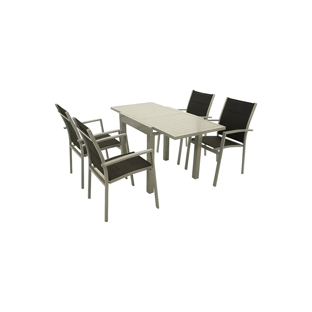 Diese 5-teilige Balkon-Garnitur verbindet modernes Design, Komfort und langlebige Materialien zu einem stilvollen Ensemble für Balkon, Terrasse oder kleinere Außenbereiche. Das Set besteht aus vier stapelbaren Sesseln mit Armlehnen und einem praktischen Ausziehtisch, die zusammen flexible und komfortable Sitzmöglichkeiten bieten. Die Sessel verfügen über ein stabiles Aluminiumgestell mit silbergrauem Finish, das pulverbeschichtet ist und dadurch besonders widerstandsfähig gegenüber Witterungseinflüssen, Kratzern und Korrosion bleibt. Sitz und Rücken sind mit strapazierfähigem Textilgewebe in Schwarz bespannt, das für bequemen Sitzkomfort sorgt und gleichzeitig pflegeleicht ist. Dank des Stapeldesigns lassen sich die Sessel bei Bedarf platzsparend verstauen. Mit den Maßen von ca. 56 cm Breite, 96 cm Höhe und 65 cm Tiefe bieten die Sessel großzügige und ergonomische Sitzflächen. Der Ausziehtisch ist aus robustem Aluminium mit silbergrauem Finish gefertigt und ebenfalls pulverbeschichtet, wodurch er langlebig und witterungsbeständig bleibt. Die Tischplatte mit Rillen sorgt für eine elegante Optik und erleichtert gleichzeitig den Wasserablauf, sodass die Fläche nach Regen schnell wieder nutzbar ist. Mit den Maßen von ca. 70 cm Breite, 75 cm Höhe und 70 cm Tiefe im Standardzustand bietet der Tisch ausreichend Platz für Mahlzeiten oder Getränke. Dank der praktischen Auszugsfunktion lässt sich die Tischfläche bei Bedarf auf ca. 140 cm Breite erweitern und schafft zusätzlichen Raum für Gäste oder mehr Komfort beim Essen. Ein stilvolles und funktionales Set, das moderne Optik, komfortable Sitzplätze und flexiblen Tischgebrauch perfekt miteinander verbindet.