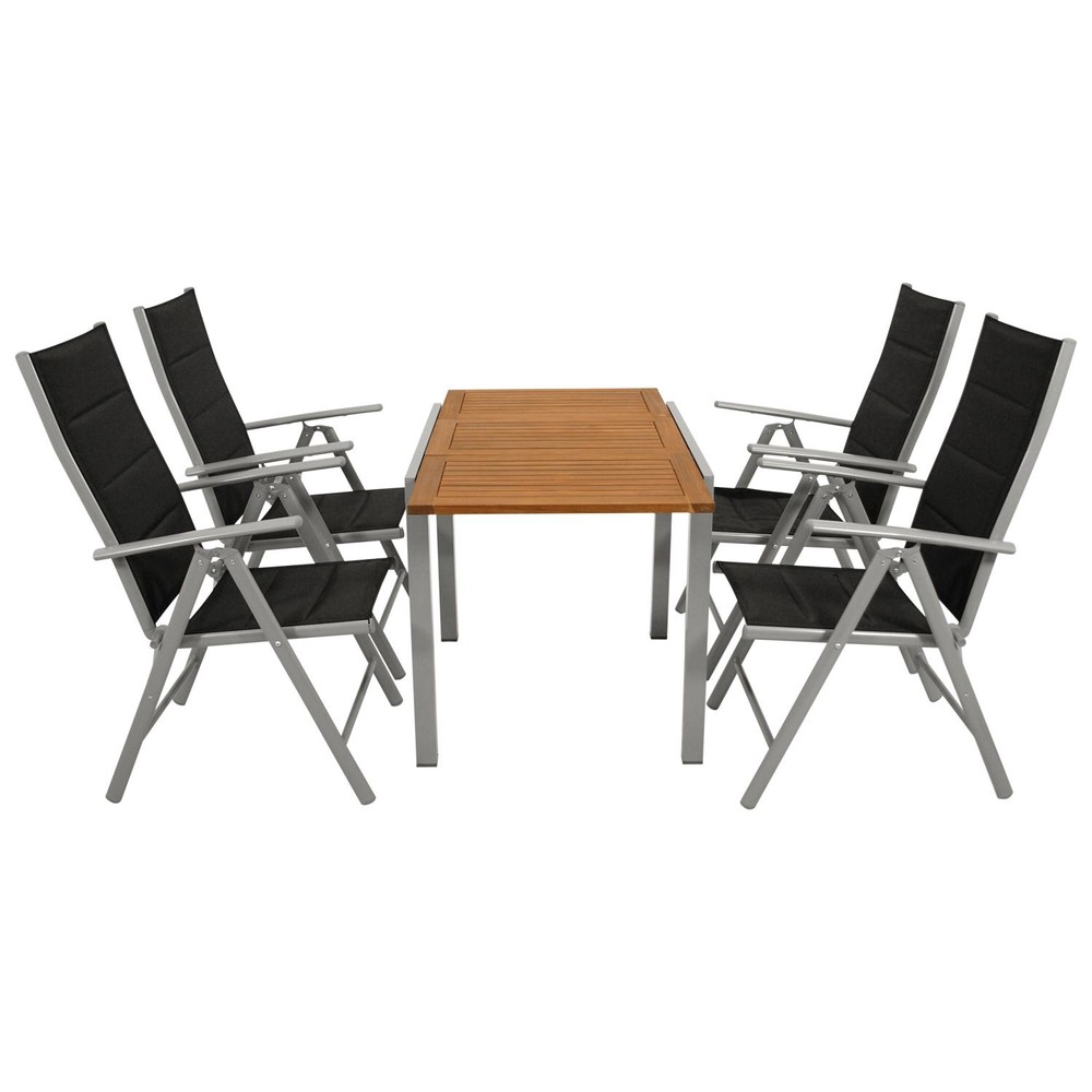 Diese 5-teilige Garnitur mit eleganten, klappbaren Stühlen vereint erstklassigen Komfort mit langlebiger Qualität dank hochwertiger Materialien. Das Aluminium hat ein pulverbeschichtetes Finish und ist somit witterungsbeständig. Die schönen Sommertage können mit dieser Garnitur in Ihrem Garten auf jeden Fall kommen.