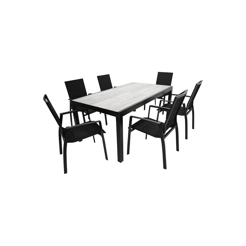 Diese 7-teilige Gartengarnitur vereint modernes Design, Komfort und hochwertige Materialien zu einem eleganten Ensemble für Terrasse, Garten oder Balkon. Sie besteht aus sechs stapelbaren Sesseln mit Armlehnen und einem großen Ausziehtisch, die zusammen einen stilvollen und flexiblen Essbereich im Freien bilden. Die Sessel verfügen über ein robustes Aluminiumgestell mit schwarzem Finish, das pulverbeschichtet ist und somit besonders widerstandsfähig gegenüber Witterungseinflüssen, Kratzern und Korrosion bleibt. Der Bezug besteht aus schwarzem Kunstgewebe mit leichter Polsterung, die für ein komfortables Sitzgefühl sorgt und gleichzeitig pflegeleicht ist. Mit den Maßen von ca. 56 cm Breite, 96 cm Höhe und 65 cm Tiefe bieten die Sessel großzügigen Komfort und lassen sich dank des Stapeldesigns bei Bedarf platzsparend verstauen. Der Ausziehtisch verfügt über ein stabiles Aluminiumgestell mit schwarzem Finish, ebenfalls pulverbeschichtet, und eine elegante Tischplatte aus Sicherheitsglas mit Keramikoptik in Grau, die besonders widerstandsfähig und pflegeleicht ist. Mit den Maßen von ca. 180 cm Breite, 75 cm Höhe und 100 cm Tiefe im Standardzustand bietet der Tisch viel Platz für Mahlzeiten im kleineren Rahmen. Dank der praktischen Auszugsfunktion lässt sich die Tischfläche bei Bedarf auf ca. 240 cm Breite erweitern, sodass auch größere Runden bequem Platz finden. Dieses Set vereint stilvolles Design, komfortable Sitzmöglichkeiten und flexible Nutzung und schafft so einen einladenden und modernen Essbereich für entspannte Stunden im Freien.