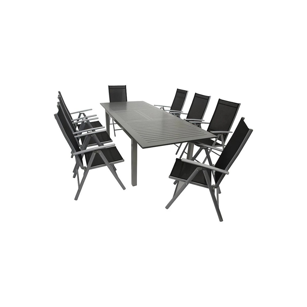 Diese 9-teilige Garnitur vereint modernes Design, hochwertige Materialien und durchdachte Funktionalität und ist ideal für Garten, Terrasse oder größere Balkone. Sie besteht aus acht Klappsesseln mit Armlehnen und einem großen Ausziehtisch, die zusammen ein komfortables und flexibles Ess- und Sitzensemble bilden. Die Sessel verfügen über ein stabiles Aluminiumgestell mit grauem Finish, das pulverbeschichtet ist und dadurch besonders widerstandsfähig gegen Witterungseinflüsse, Kratzer und Korrosion bleibt. Sitz und Rücken sind mit schwarzem Textilgewebe bespannt, das pflegeleicht, atmungsaktiv und bequem ist. Mit den Maßen von ca. 56 cm Breite, 107 cm Höhe und 66 cm Tiefe bieten die Sessel großzügigen Komfort, während die Klappfunktion ein platzsparendes Verstauen und flexibles Umstellen ermöglicht. Der Ausziehtisch besteht ebenfalls aus robustem Aluminium mit grauem Finish, pulverbeschichtet, und verfügt über eine Tischplatte mit Rillen, die nicht nur optisch Akzente setzt, sondern auch das Wasserablaufen erleichtert. Mit den Maßen von ca. 174 cm Breite, 76 cm Höhe und 100 cm Tiefe im Standardzustand bietet der Tisch ausreichend Platz für Mahlzeiten und Getränke. Dank der praktischen Auszugsfunktion lässt sich die Tischfläche bei Bedarf auf ca. 244 cm Breite erweitern und schafft zusätzlichen Raum für Gäste oder größere Tischdekorationen. Dieses Set überzeugt durch praktische Klappsessel, flexiblen Tischgebrauch und modernes Design und bietet eine stilvolle Lösung für gesellige Stunden im Außenbereich.