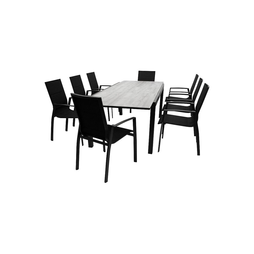 Diese 9-teilige Garnitur überzeugt durch modernes Design, hohen Sitzkomfort und langlebige Materialien und ist ideal für Garten, Terrasse oder größere Balkonflächen. Das Set besteht aus acht stapelbaren Sesseln mit Armlehnen und einem großen Ausziehtisch, die zusammen ein stilvolles und komfortables Ess- und Lounge-Arrangement bilden. Die Sessel verfügen über ein stabiles Aluminiumgestell mit schwarzem Finish, das pulverbeschichtet ist und dadurch besonders widerstandsfähig gegen Witterungseinflüsse, Korrosion und Kratzer bleibt. Der Bezug besteht aus hochwertigem schwarzem Kunstgewebe mit Polsterung, das nicht nur elegant wirkt, sondern auch bequem und pflegeleicht ist. Mit den Maßen von ca. 56 cm Breite, 96 cm Höhe und 65 cm Tiefe bieten die Sessel großzügigen Sitzkomfort, während sie durch ihr Stapeldesign bei Nichtgebrauch platzsparend verstaut werden können. Der Ausziehtisch ist aus robustem Aluminium mit schwarzem Finish gefertigt, ebenfalls pulverbeschichtet, und verfügt über eine elegante Tischplatte aus Sicherheitsglas mit Keramikoptik in Grau. Die Oberfläche ist besonders pflegeleicht, widerstandsfähig und verleiht dem Tisch eine moderne, hochwertige Ausstrahlung. Mit den Maßen von ca. 180 cm Breite, 75 cm Höhe und 100 cm Tiefe im Standardzustand bietet der Tisch viel Platz für Speisen und Getränke. Dank der praktischen Auszugsfunktion lässt sich die Tischfläche bei Bedarf auf ca. 240 cm Breite erweitern und schafft zusätzlichen Raum für Gäste. Diese Garnitur vereint komfortable Sitzplätze, flexiblen Tischgebrauch und modernes Design und sorgt für ein stilvolles und einladendes Ambiente im Außenbereich.