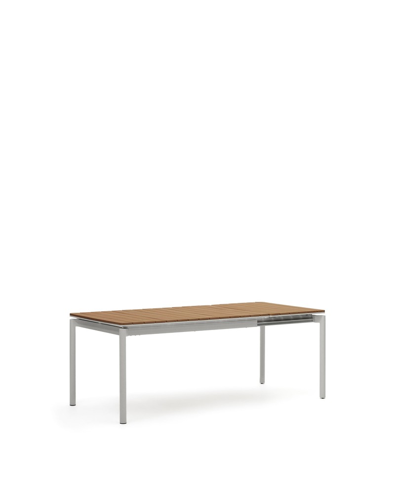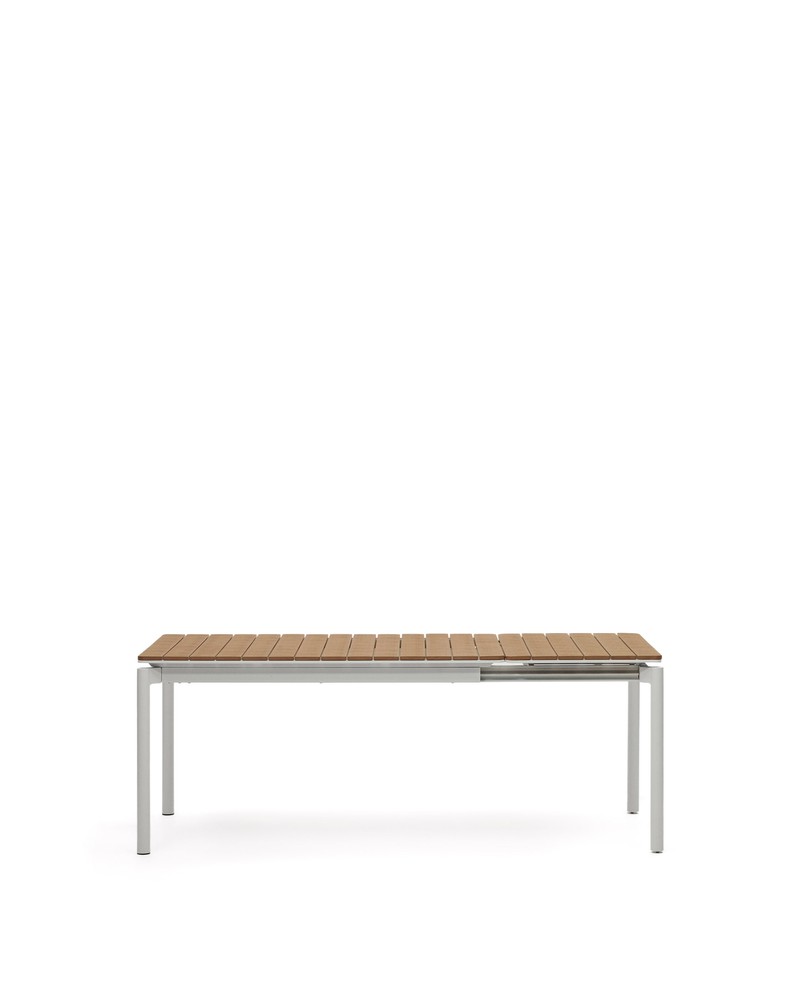 Verleihen Sie Ihrem Außen- und Innenbereich stilvolle Funktionalität und zeitlose Eleganz mit diesem ausziehbaren Gartentisch. Das leichte Gestell aus Aluminium in hellgrauem Finish sorgt nicht nur für eine moderne Optik, sondern garantiert auch Witterungsbeständigkeit und Stabilität, während die Tischplatte aus Polystyrol mit natürlichem Finish eine pflegeleichte und zugleich hochwertige Oberfläche bietet. Die subtile Struktur der Platte unterstreicht das elegante Design und verleiht dem Tisch eine natürliche Ausstrahlung. Dank des praktischen Selbst-einfahrenden Ausziehmechanismus lässt sich der Tisch mühelos vergrößern – von 6 Sitzplätzen im Standardformat auf bis zu 8 Sitzplätze, wenn mehr Platz benötigt wird. Die flache Oberkante sorgt für eine klare Linienführung und lässt sich hervorragend mit verschiedenen Stühlen und Sitzgelegenheiten kombinieren. Der Tisch ist zu 100 % für den Einsatz im Innen- und Außenbereich geeignet, wodurch er ideal für Garten, Terrasse, Balkon oder Wintergarten ist. Die Kombination aus robustem Aluminiumgestell und pflegeleichter Polystyrol-Oberfläche macht ihn wetterbeständig, langlebig und leicht zu reinigen, ohne dass dabei Design oder Komfort verloren gehen.