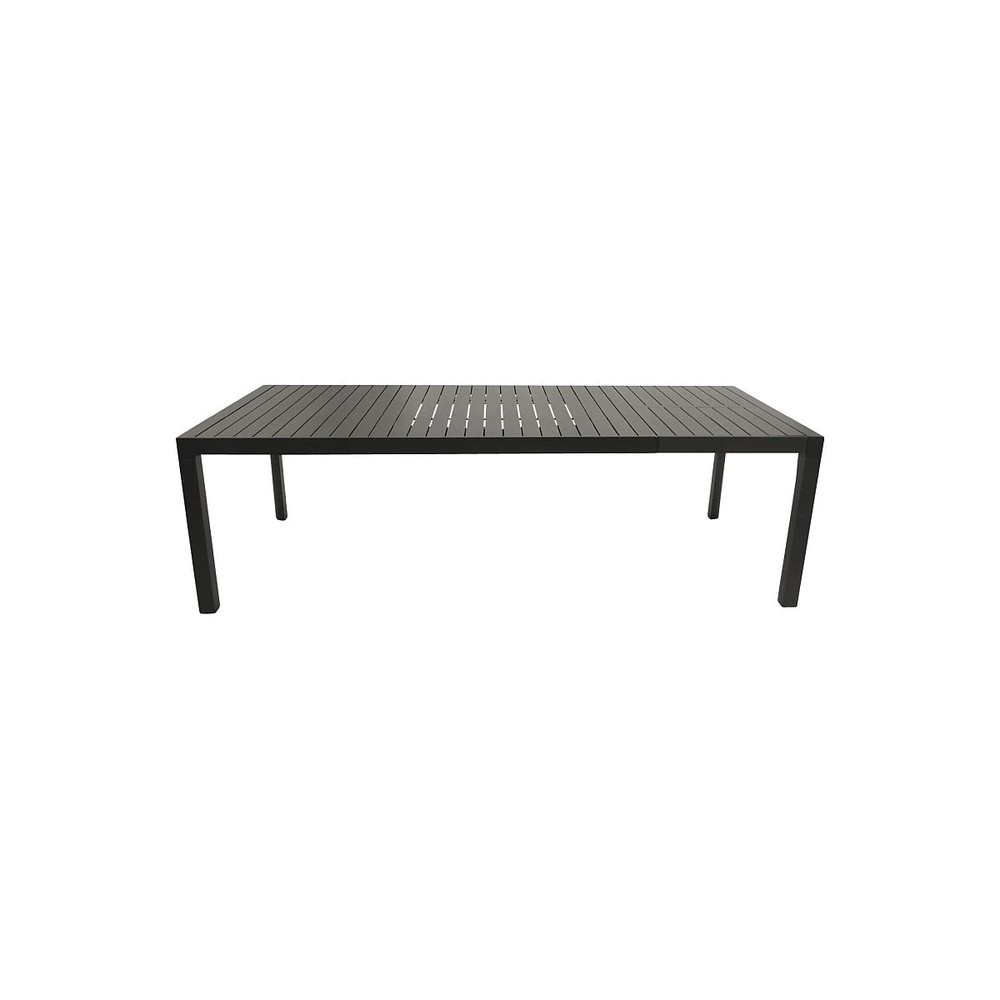 Dieser Ausziehtisch aus Aluminium in Anthrazit verbindet modernes Design mit höchster Funktionalität und robuster Verarbeitung. Das elegante Anthrazit-Finish verleiht dem Tisch eine zeitlose, stilvolle Optik, die sich harmonisch in jede Terrasse, jeden Garten oder Balkon einfügt und zugleich ein dezentes Highlight im Außenbereich setzt. Gefertigt aus leichtem und langlebigem Aluminium, ist der Tisch besonders widerstandsfähig gegenüber Witterungseinflüssen. Die pulverbeschichtete Oberfläche schützt zuverlässig vor Korrosion, Kratzern und UV-Einflüssen, sodass Sie lange Freude an diesem pflegeleichten Gartenmöbel haben. Ein zentrales Feature ist der Butterfly-Auszug, mit dem sich die Tischfläche bei Bedarf schnell und unkompliziert vergrößern lässt. So können Sie flexibel auf unterschiedliche Platzbedürfnisse reagieren – ob für kleinere Zusammenkünfte oder größere Runden. Die Tischplatte überzeugt in moderner Lamellen-Optik, die nicht nur elegant wirkt, sondern auch dafür sorgt, dass Regenwasser besser ablaufen kann und die Oberfläche schneller trocknet. Die Beine des Tisches sind innen gebogen gestaltet, was dem Möbelstück eine besondere optische Leichtigkeit verleiht und gleichzeitig für Stabilität sorgt. Durch die durchdachte Konstruktion steht der Tisch jederzeit sicher, auch auf unebenen Flächen. Mit seinen großzügigen Maßen von ca. 195 cm Breite im geschlossenen Zustand, 76 cm Höhe und 120 cm Tiefe bietet der Tisch ausreichend Platz für Familie und Freunde. Bei Bedarf lässt er sich dank des Butterfly-Auszugs auf ca. 255 cm Breite erweitern und schafft zusätzlichen Raum für Speisen, Getränke und geselliges Beisammensein. Ein eleganter und funktionaler Tisch, der Design und Vielseitigkeit perfekt vereint.
