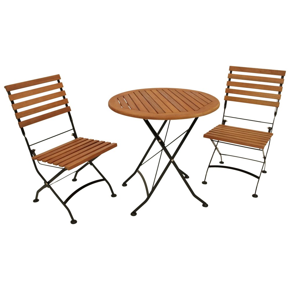 Eine wunderschöne 3-teilige Garnitur aus Eukalyptus, für Ihren Außenbereich. Die Garnitur enthält zwei klappbare Stühle und einen runden Tisch. Hergestellt aus Flachstahl und einer Tischplatte aus Eukalyptus ist diese Garnitur optisch sehr ansprechend und bietet komfortable Sitzmöglichkeiten. Mit dieser Garnitur können die Sommertage definitiv kommen.