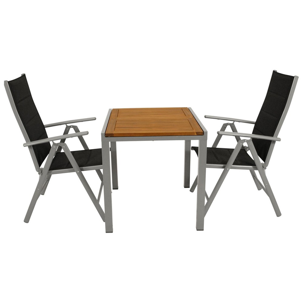 Eine wunderschöne 3-teilige Garnitur für Ihren Außenbereich. Die Garnitur enthält zwei klappbare Stühle und einen praktischen Tisch. Hergestellt aus Aluminium und einer Tischplatte aus Akazie ist diese Garnitur optisch sehr ansprechend und bietet komfortable Sitzmöglichkeiten. Dank der Pulverbeschichtung halten diese Möbelstücke jeglichen Witterungseinflüssen Stand.