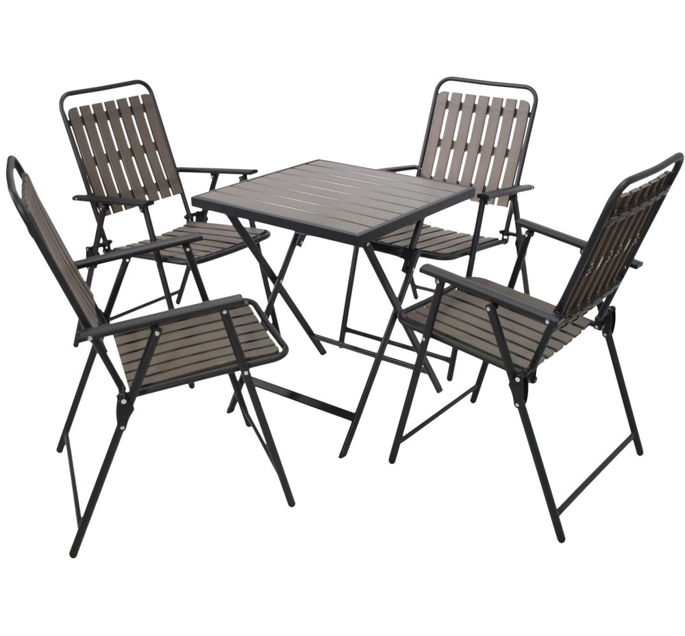 Diese 5-teilige Gartengarnitur verbindet Komfort mit stilvollem Design. Die vier Stühle aus robustem Stahl und Kunststoff bieten einen hohen Sitzkomfort. Die Kombination aus Anthrazit und Grau bringt eine moderne Note in jeden Außenbereich. Perfekt für gemütliche Grillabende mit Freunden. Dank der klappbaren Eigenschaft ist das Set einfach zu Verstauen, wenn es nicht gebraucht wird.