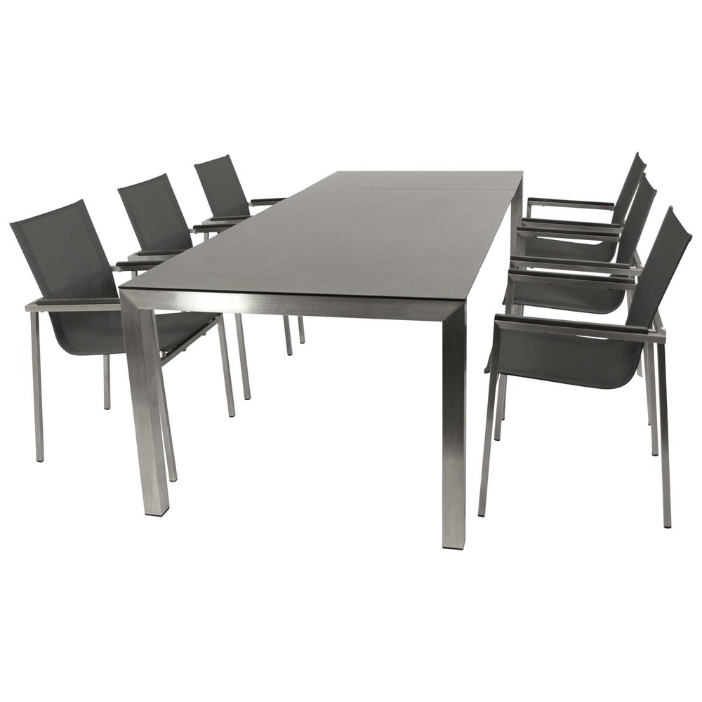 Diese elegante Garten-Garnitur bringt stilvolle Großzügigkeit in Ihren Außenbereich und schafft den perfekten Rahmen für gesellige Stunden unter freiem Himmel. Mit einem großzügigen Tisch und acht passenden Stühlen bietet sie reichlich Platz für Familie, Freunde und lange Sommerabende, an denen Gespräche, gutes Essen und entspanntes Beisammensein im Mittelpunkt stehen. Das klare, moderne Design in edlem Anthrazit verleiht der Garnitur eine ruhige, hochwertige Ausstrahlung, die sich harmonisch in Terrasse, Garten oder großzügige Außenlounge einfügt. Der Tisch bildet das stilvolle Zentrum des Sets. Die acht Stühle ergänzen das Ensemble mit einer ausgewogenen, einladenden Wirkung und sorgen dafür, dass jeder Gast bequem sitzen und den Moment genießen kann. Gefertigt aus Edelstahl, steht diese Garten-Garnitur für moderne Wertigkeit und eine besonders elegante Anmutung.