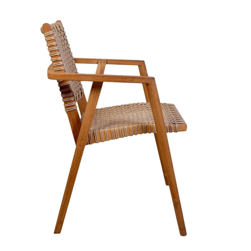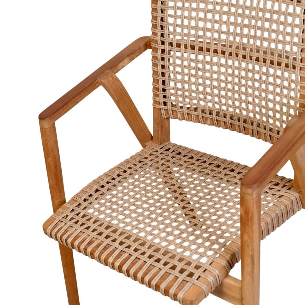 Der Rahmen sowie die Armlehnen sind aus robustem Teakholz gefertigt, dessen natürliche Maserung dem Stuhl einen edlen, langlebigen Charakter verleiht.