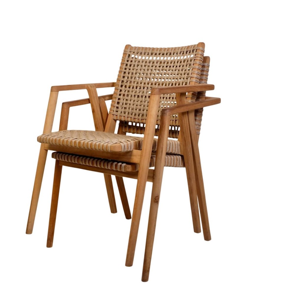 Ein stapelbarer Gartenstuhl aus Rattan und Teak vereint natürliche Optik mit praktischer Funktionalität.