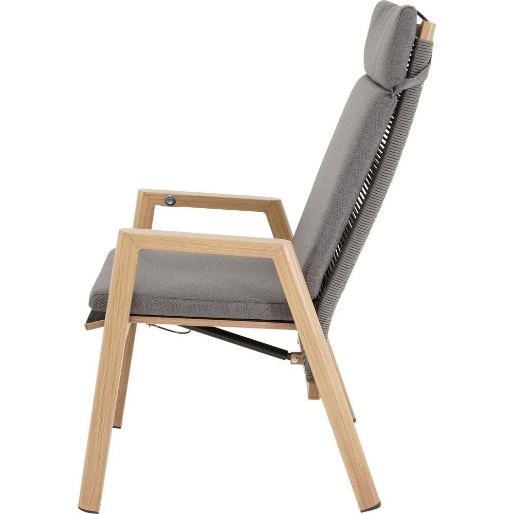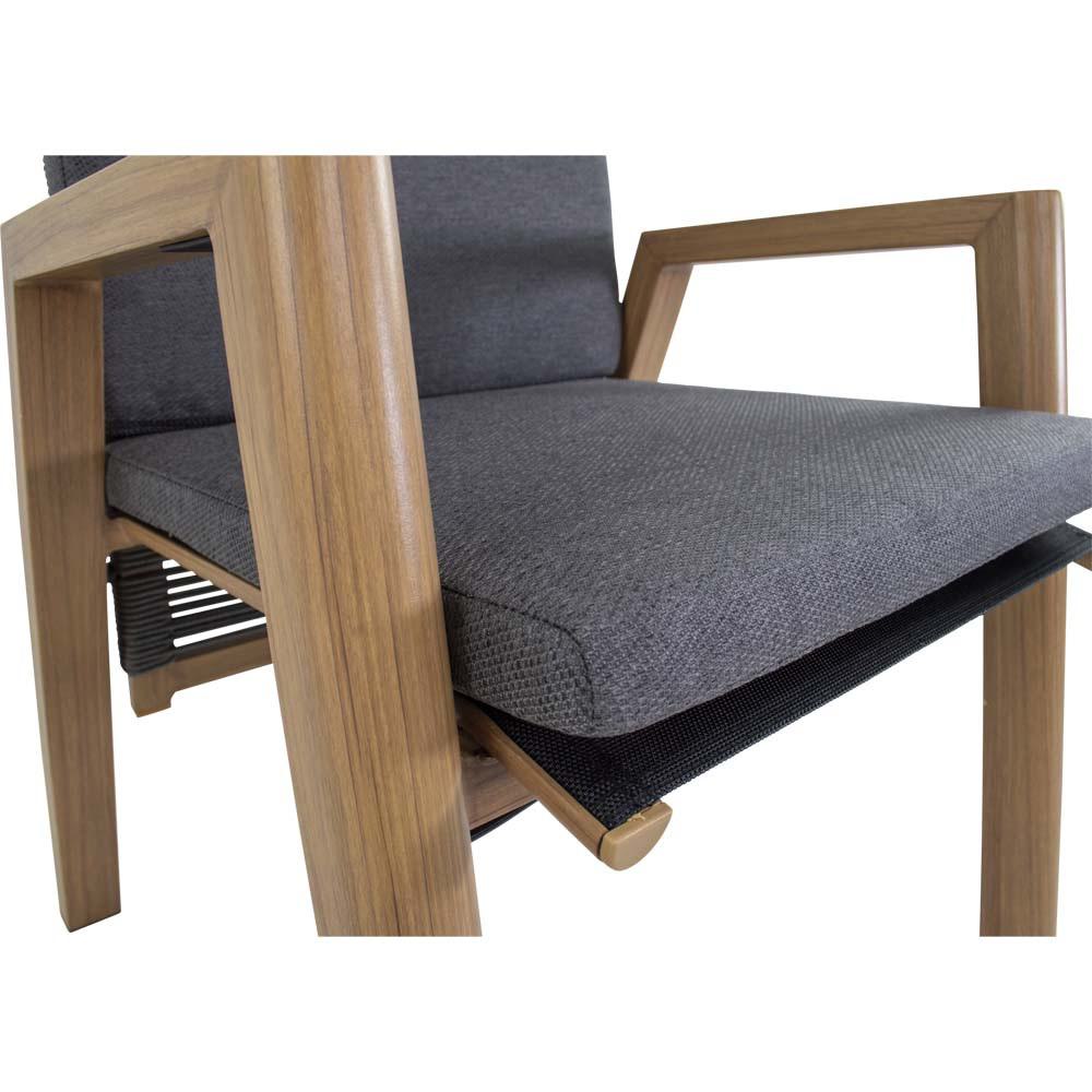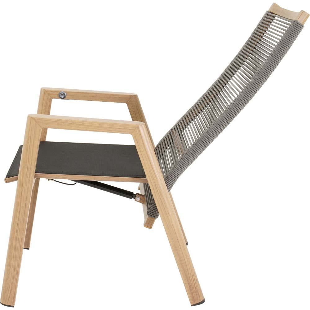 Dieser Hochlehnerstuhl verfügt über einen Aluminiumrahmen in Holzoptik. Sitz- und Rückenfläche sind funktional aufgebaut und werden durch ein Olefin-Kissen mit einem Flächengewicht von 270 g/m² ergänzt. Zusätzlich kommen Seilelemente mit einem Durchmesser von 6 mm in dunkelgrauer Farbgebung sowie schwarze Textilene-Einsätze zum Einsatz.