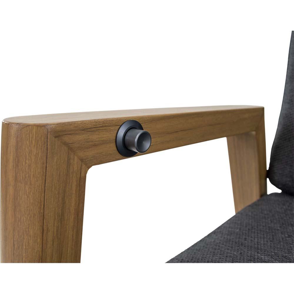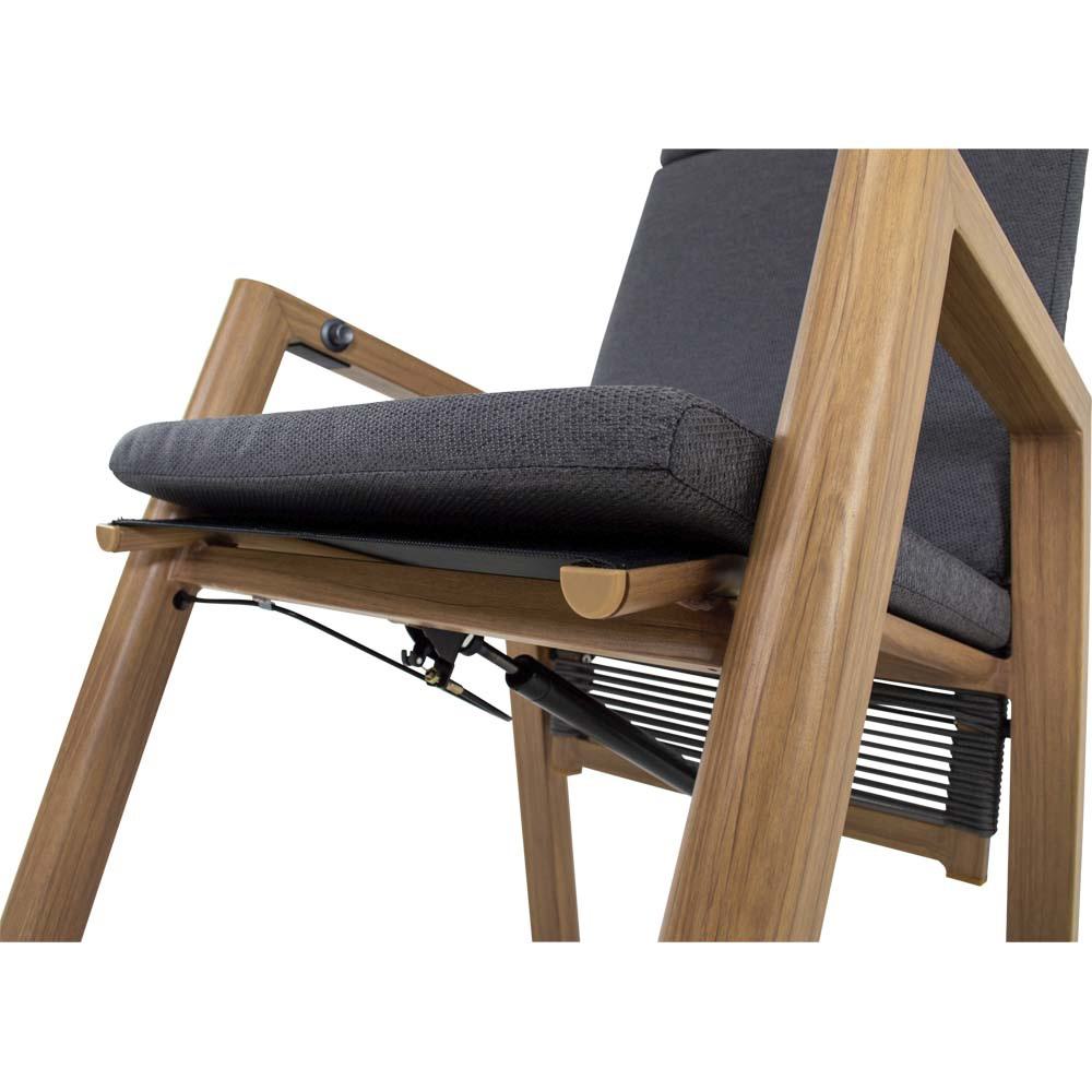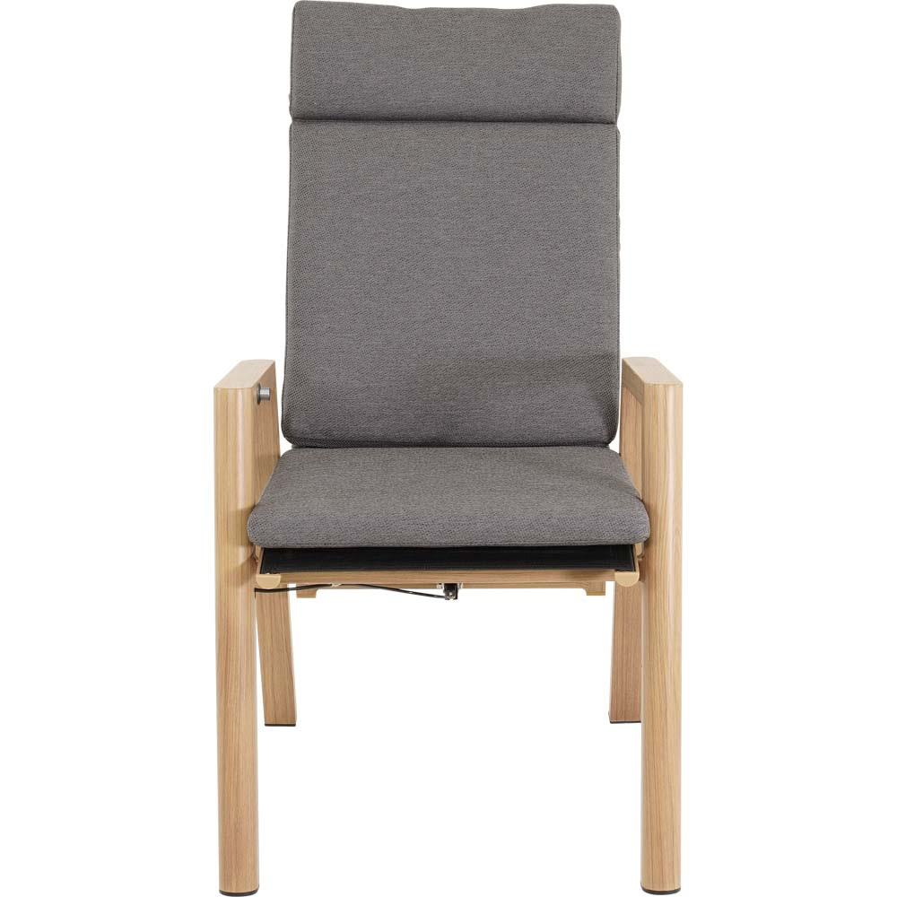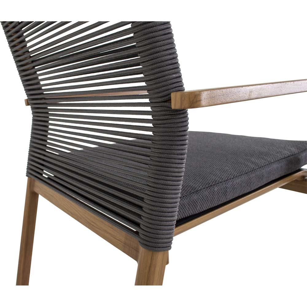 Dieser Hochlehnerstuhl verfügt über einen Aluminiumrahmen in Holzoptik. Sitz- und Rückenfläche sind funktional aufgebaut und werden durch ein Olefin-Kissen mit einem Flächengewicht von 270 g/m² ergänzt. Zusätzlich kommen Seilelemente mit einem Durchmesser von 6 mm in dunkelgrauer Farbgebung sowie schwarze Textilene-Einsätze zum Einsatz.